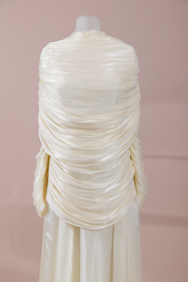 Model, iki katmanlı konstrüksiyona sahiptir. İç elbise düz ve akışkan A-line formda tasarlanmıştır; bel hattı hafif oturur, etek kısmı ise zemine doğru doğal genişleyerek dengeli bir silüet oluşturur. Üst bölümde yer alan drapeli parça omuzdan başlayarak sırt ve göğüs hattını sarar. Drapeler yatay ve diyagonal yönlü yerleştirilmiş olup hacim verirken formu bozmadan kontrollü bir düşüş sağlar. Kol boyu uzun ve bileğe kadar iner. Genel yapı, bedeni olduğundan daha uzun ve zarif gösteren dikey akış prensibiyle kurgulanmıştır.