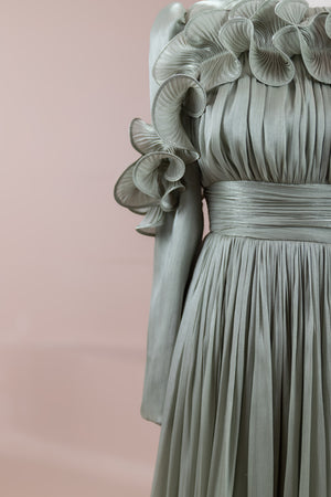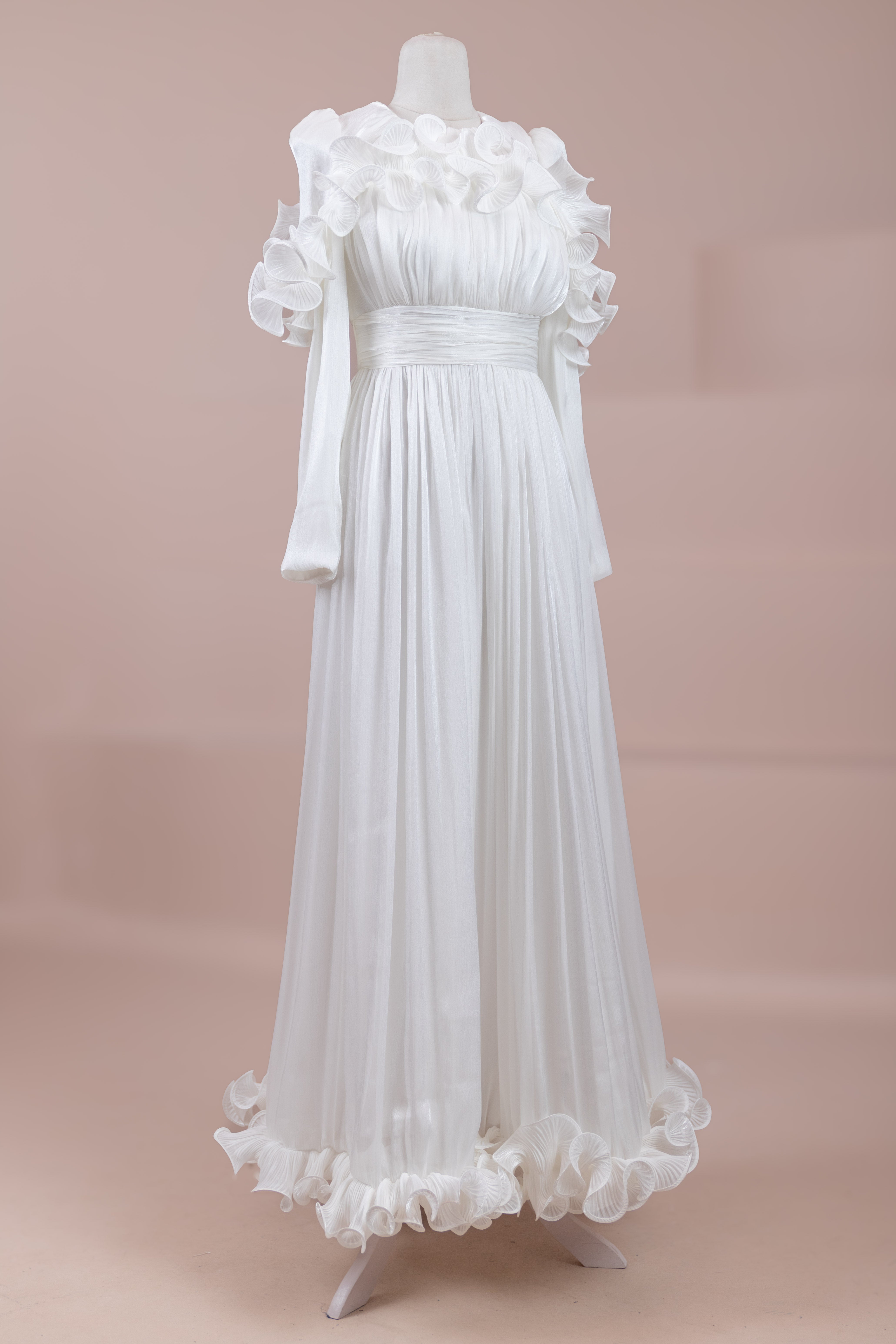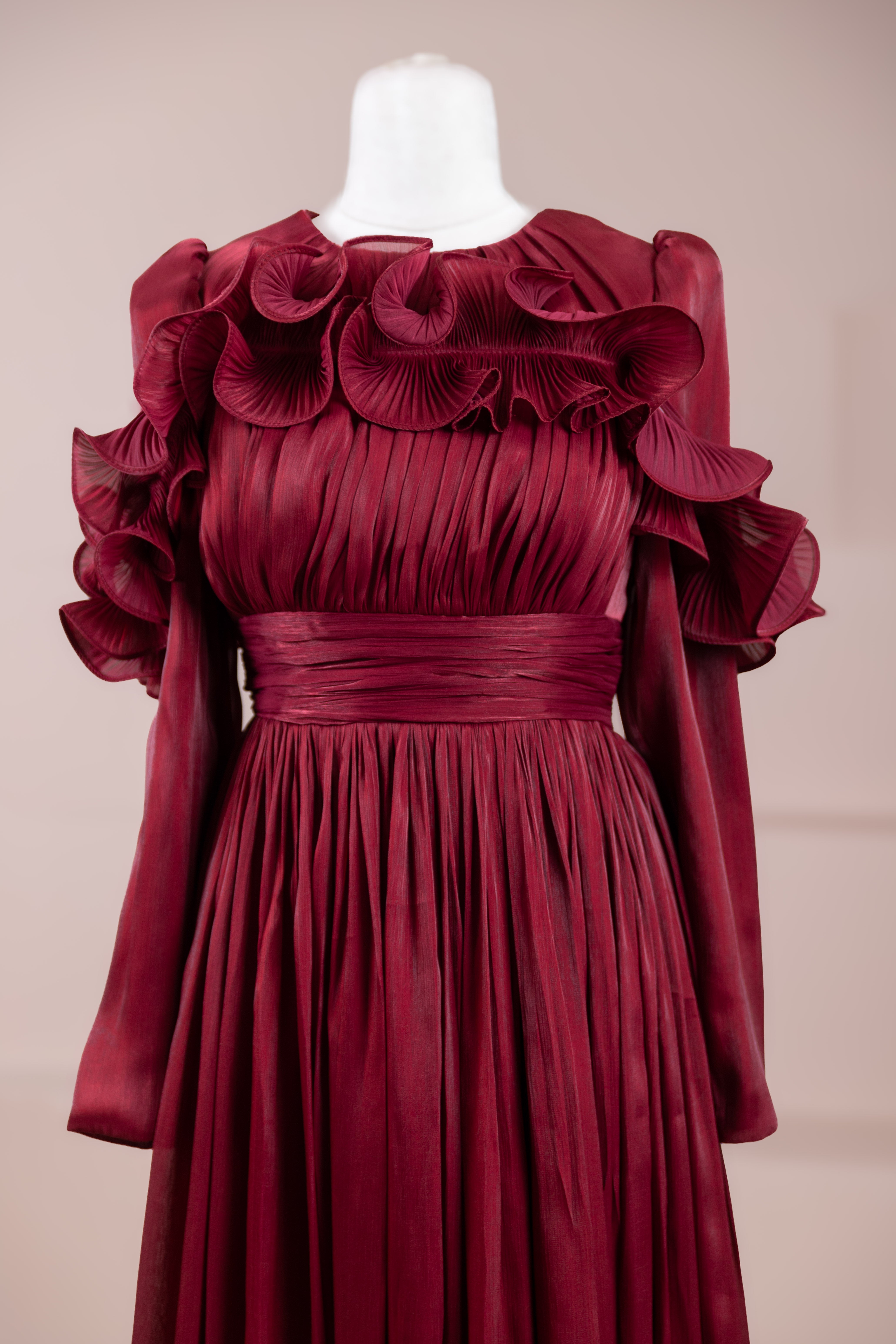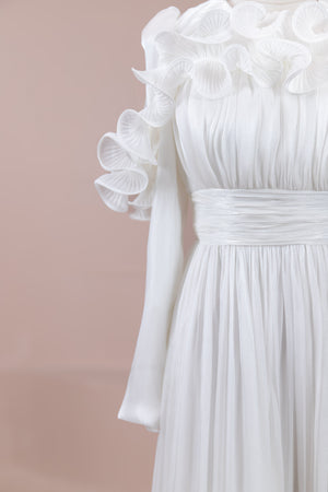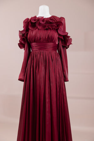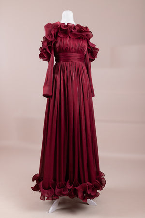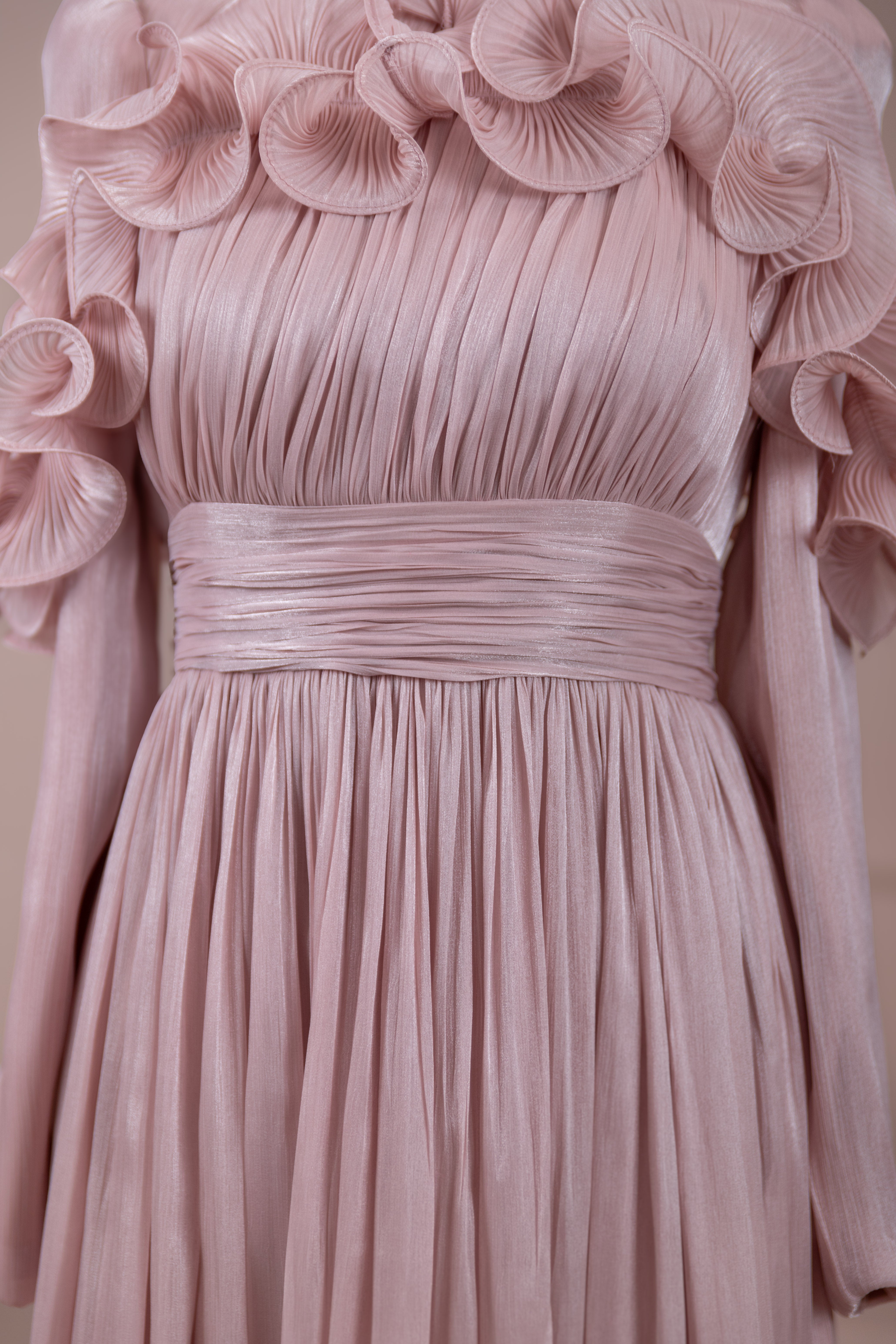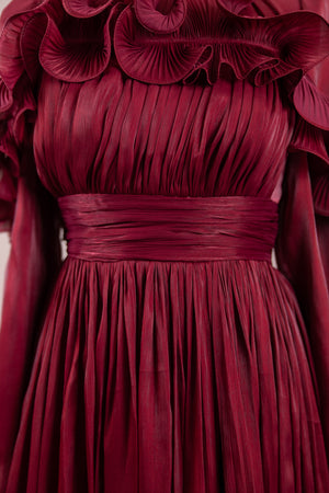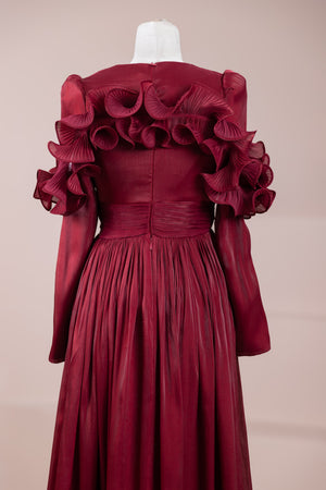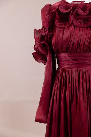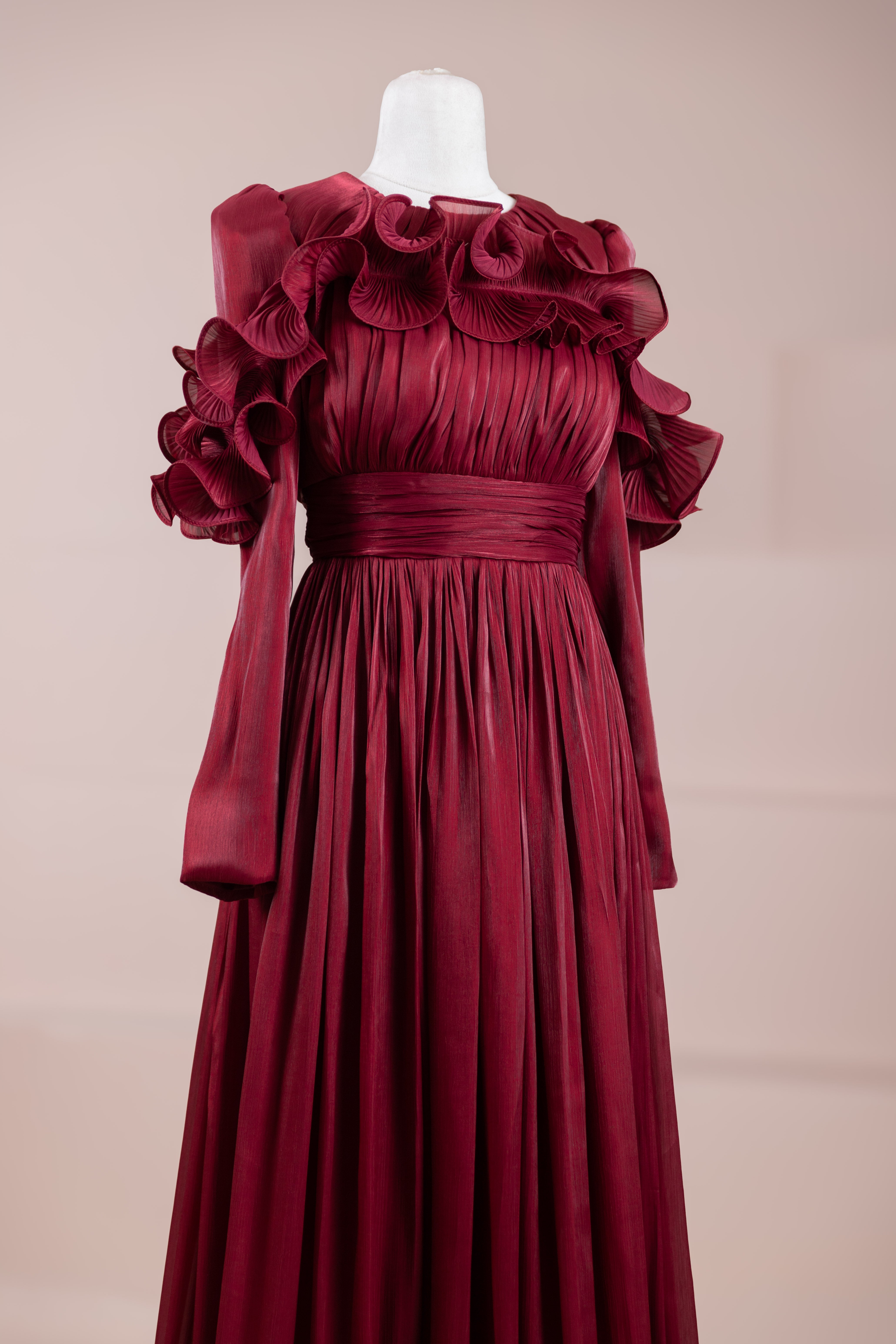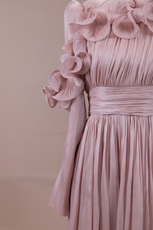 Romantik ve hacimli detaylarıyla öne çıkan bu tasarım, yüksek bel kesimi sayesinde zarif bir silüet oluşturur. Üst bedende ince pile uygulaması bulunurken, bel kısmındaki kuşak formu vücuda dengeli bir oturuş sağlar. Omuz ve etek uçlarında yer alan volan detaylar tasarıma üç boyutlu ve couture bir karakter kazandırır. Uzun ve akışkan etek formu hareketle birlikte güçlü bir duruş sergiler.