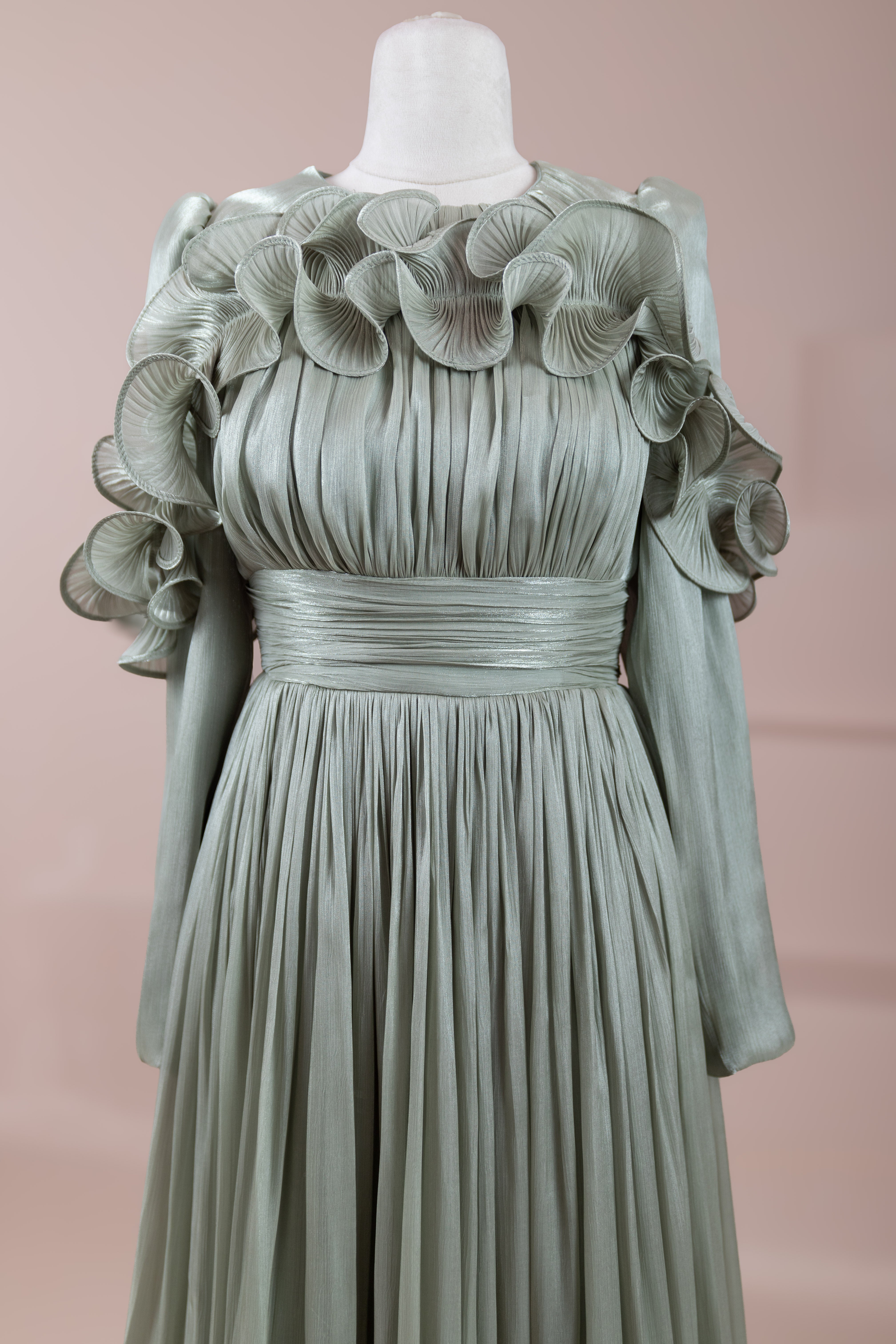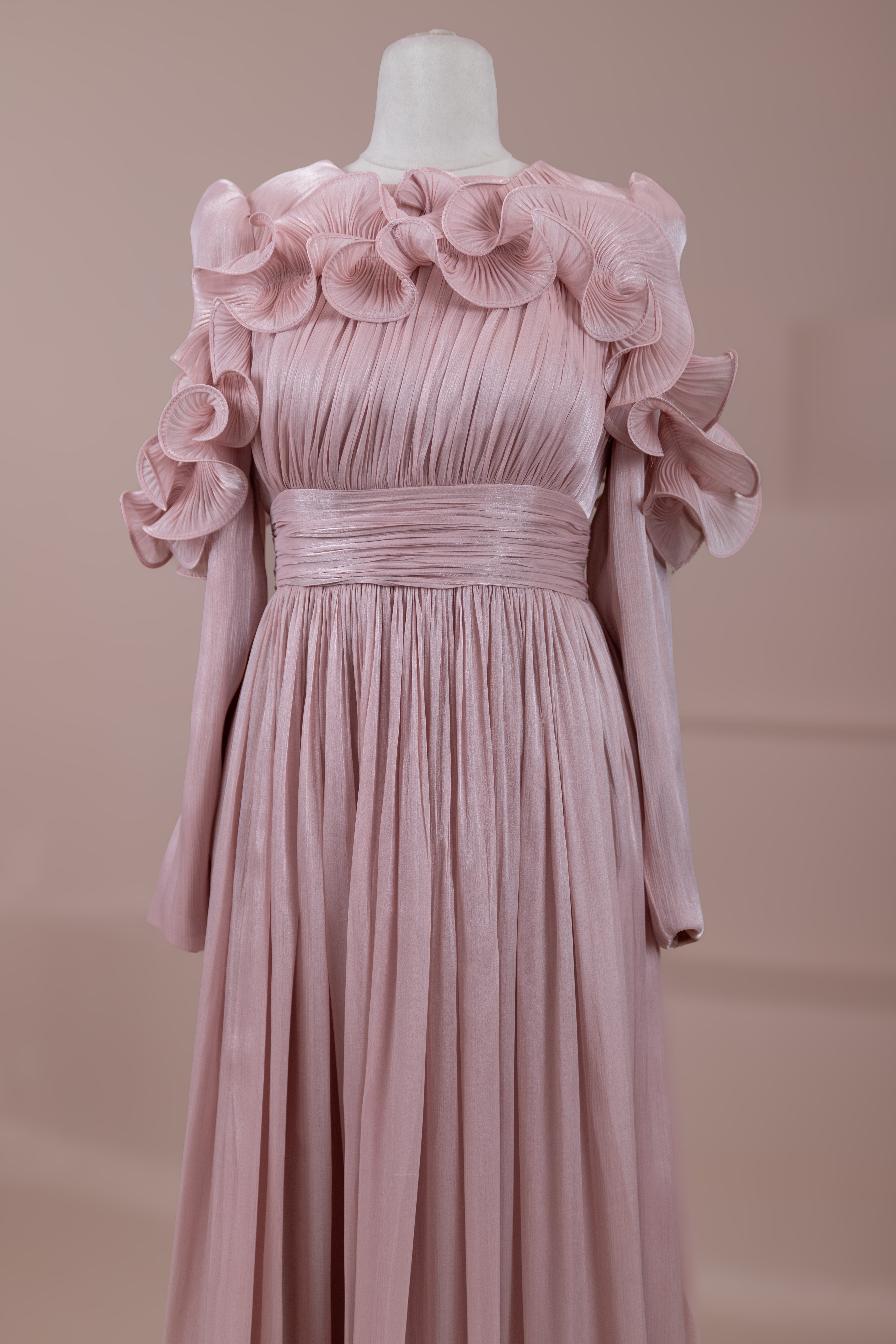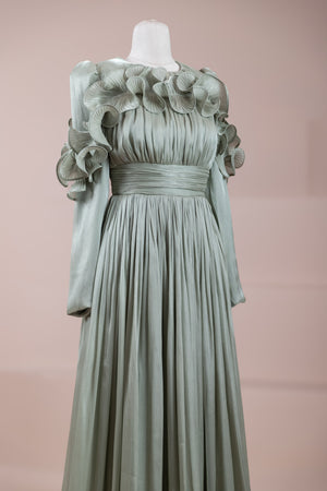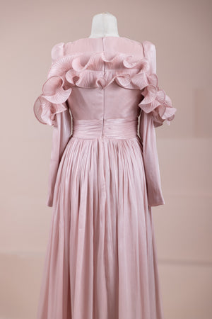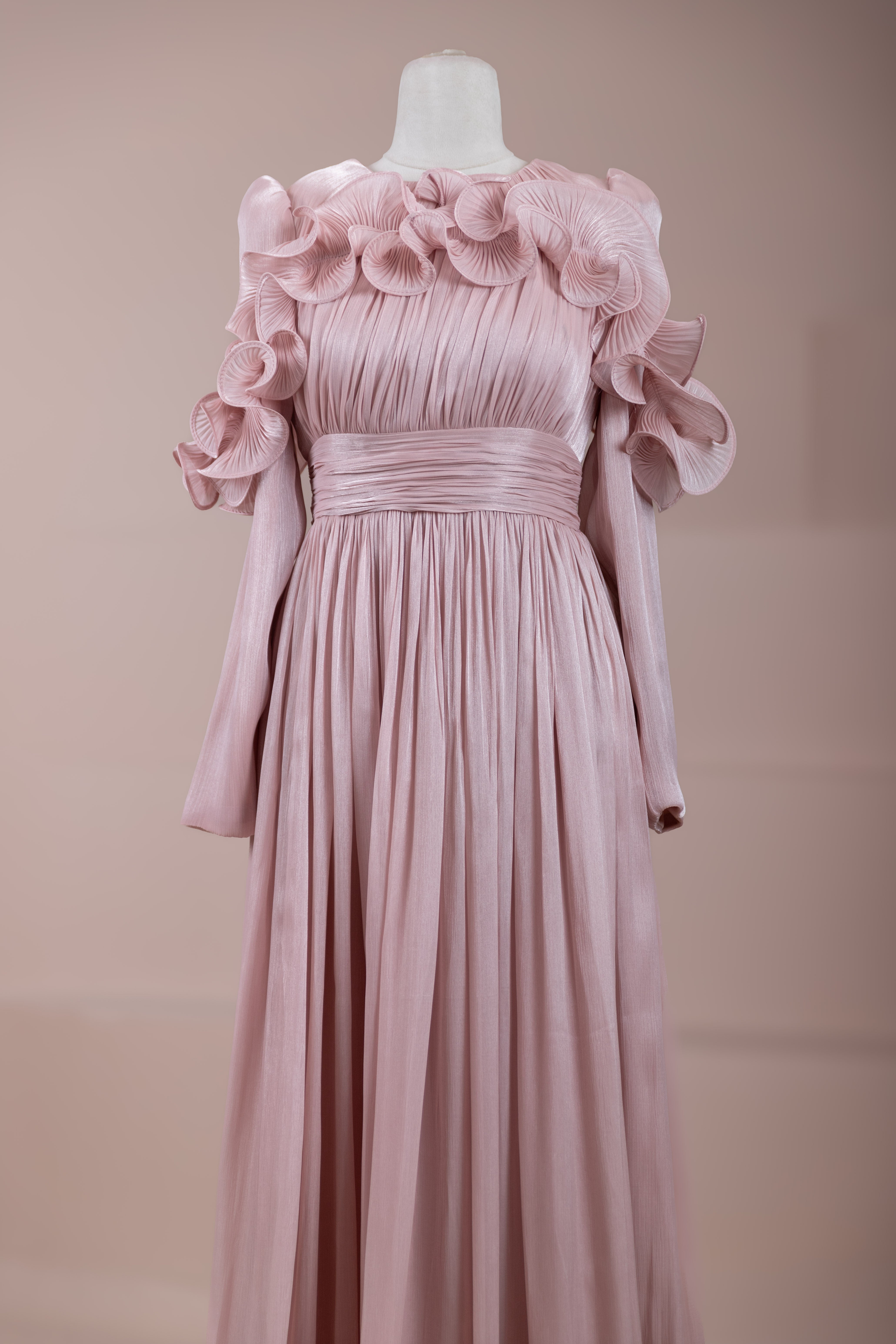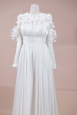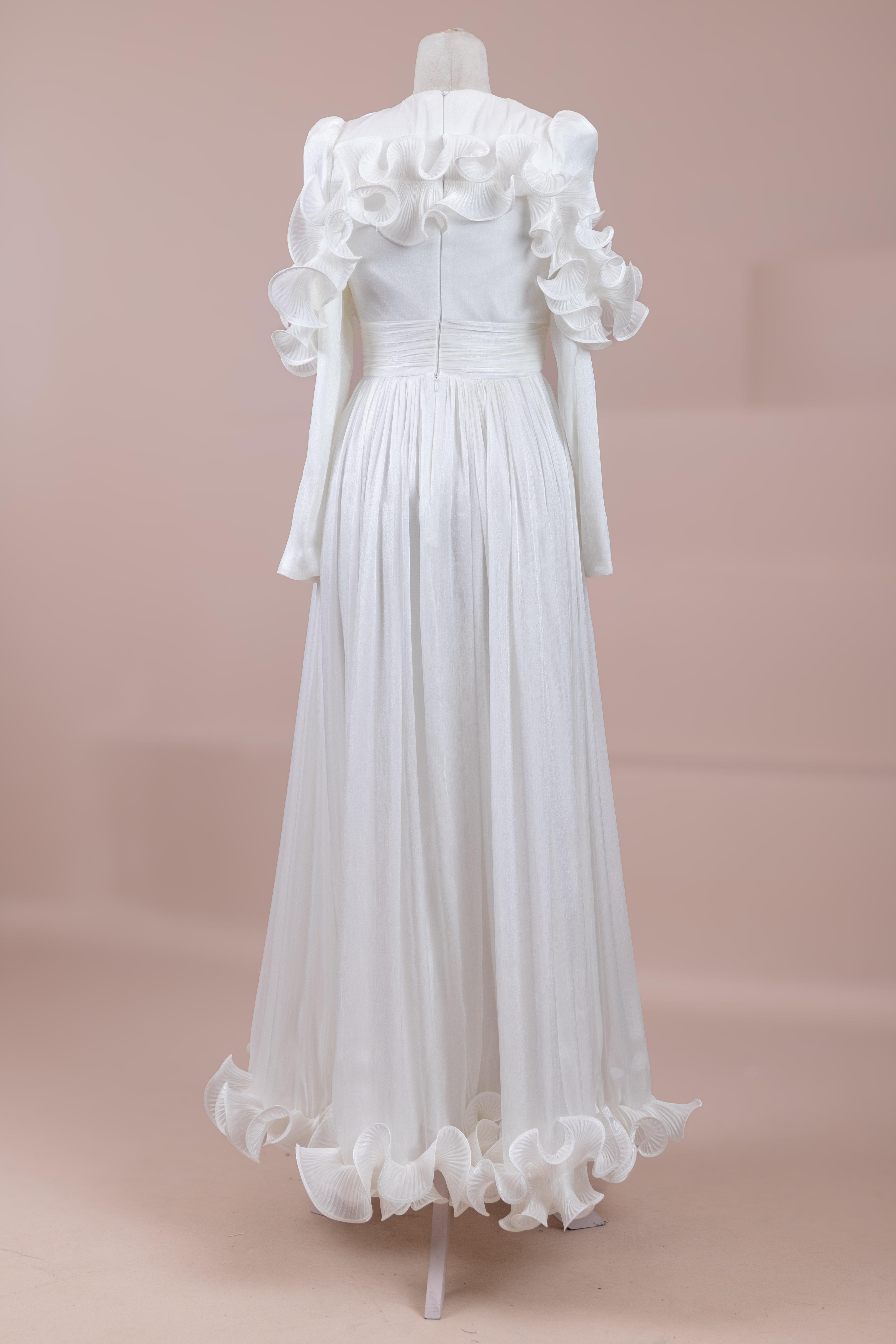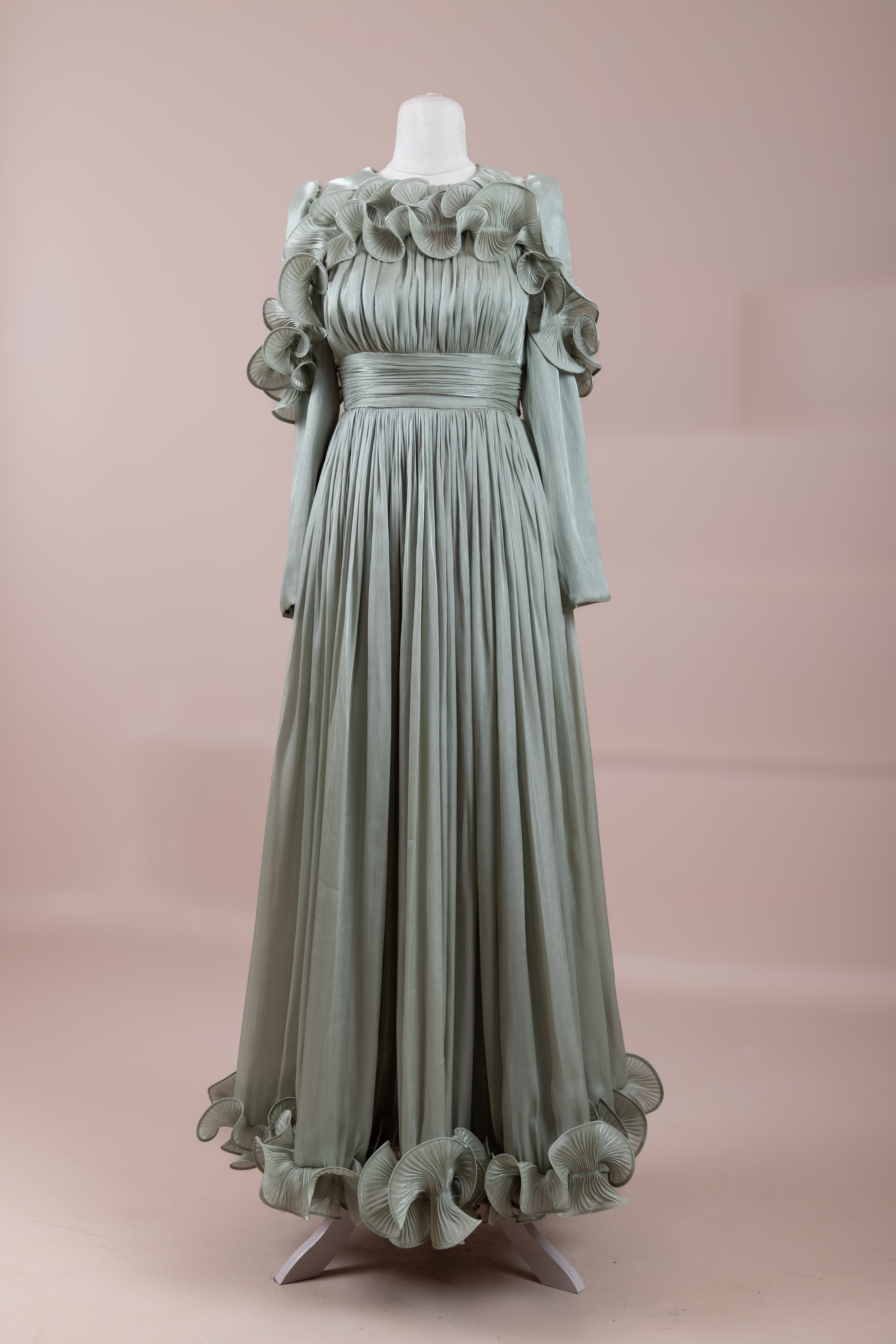 Romantik ve hacimli detaylarıyla öne çıkan bu tasarım, yüksek bel kesimi sayesinde zarif bir silüet oluşturur. Üst bedende ince pile uygulaması bulunurken, bel kısmındaki kuşak formu vücuda dengeli bir oturuş sağlar. Omuz ve etek uçlarında yer alan volan detaylar tasarıma üç boyutlu ve couture bir karakter kazandırır. Uzun ve akışkan etek formu hareketle birlikte güçlü bir duruş sergiler.