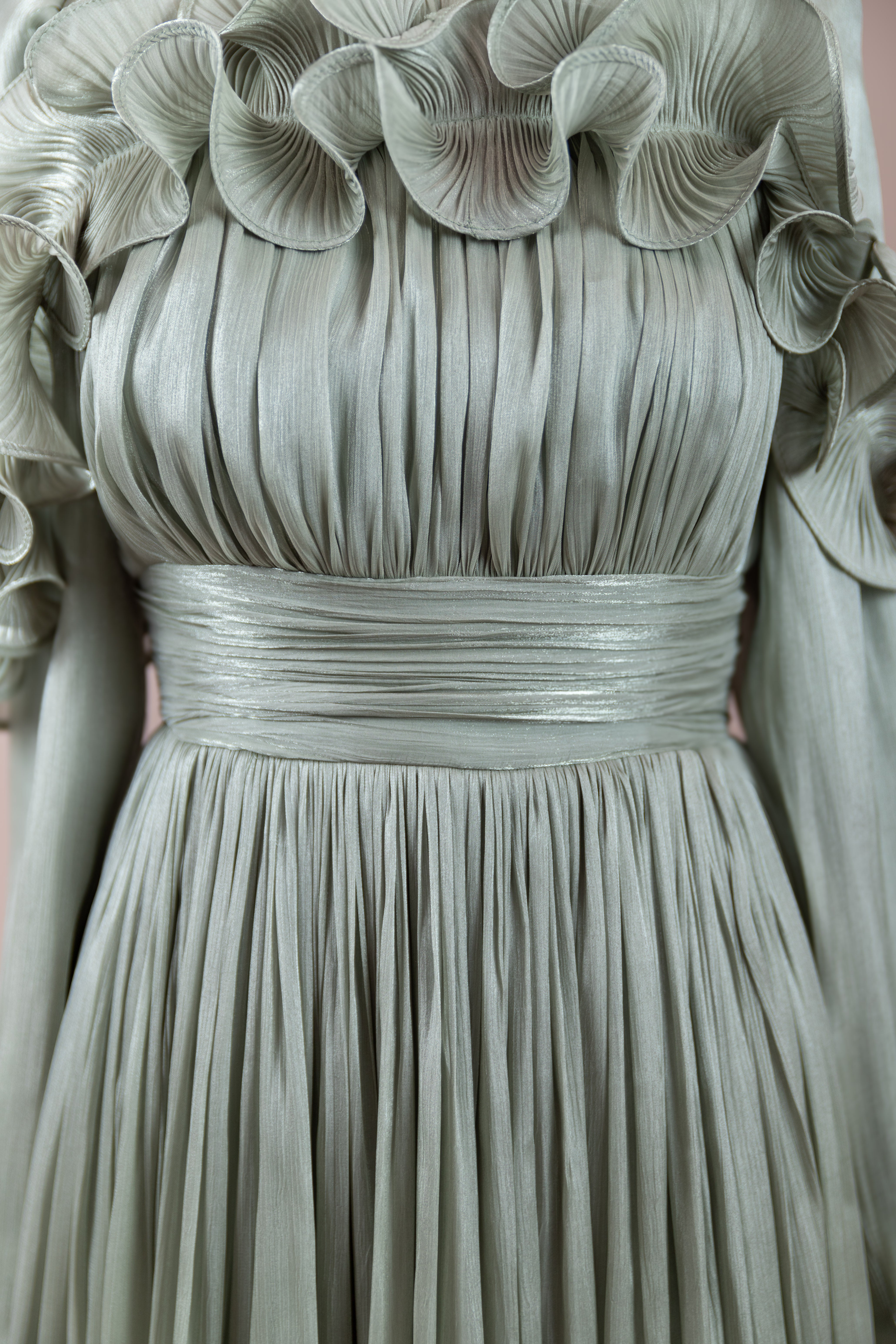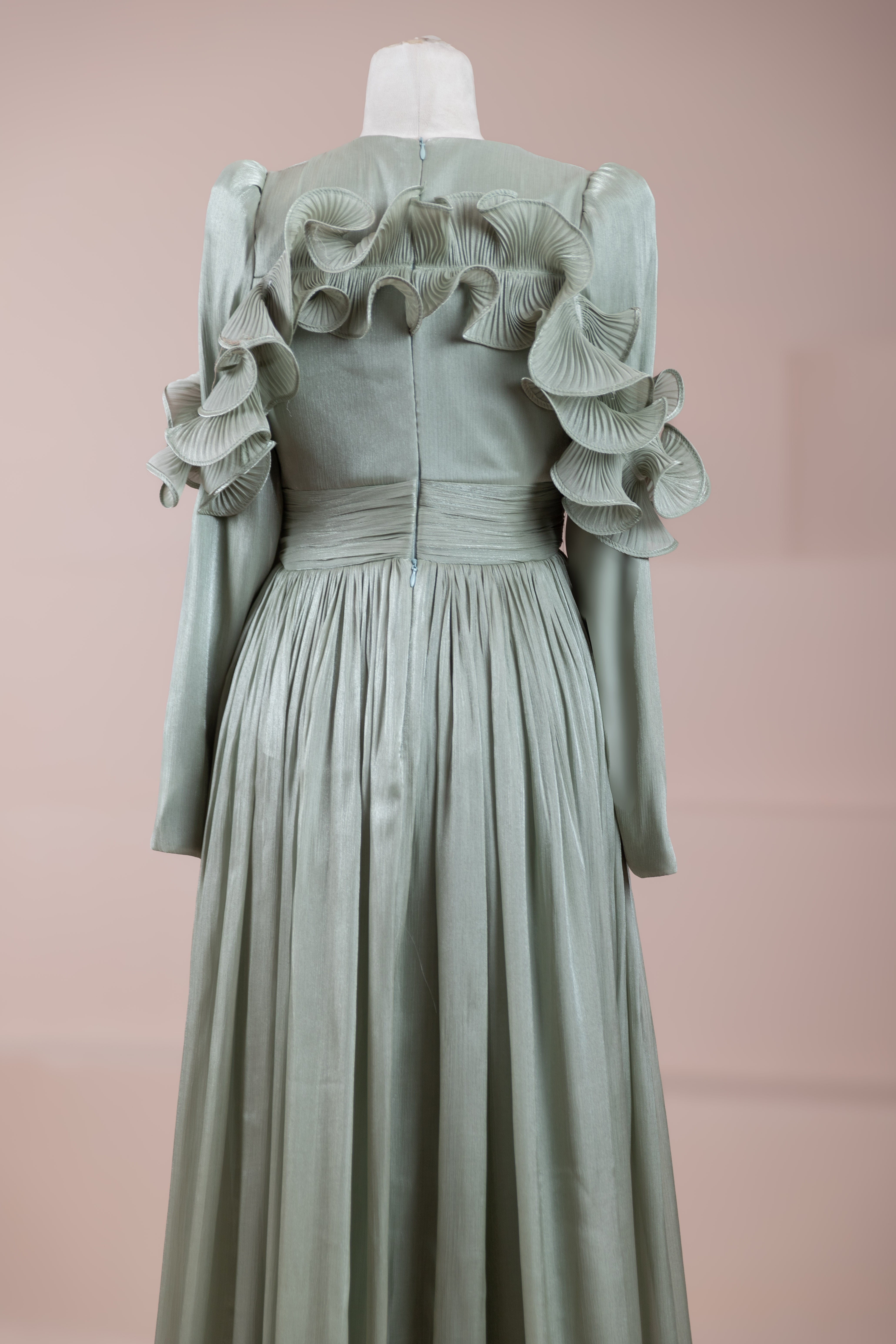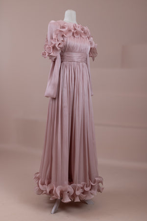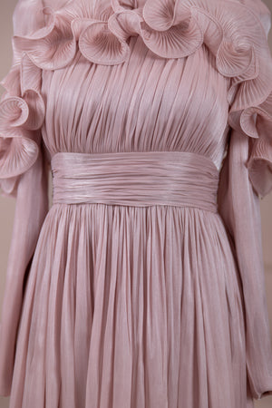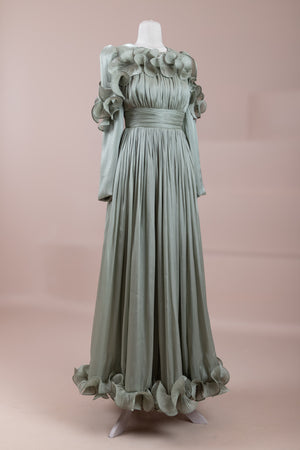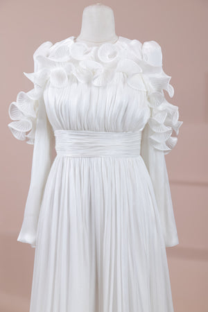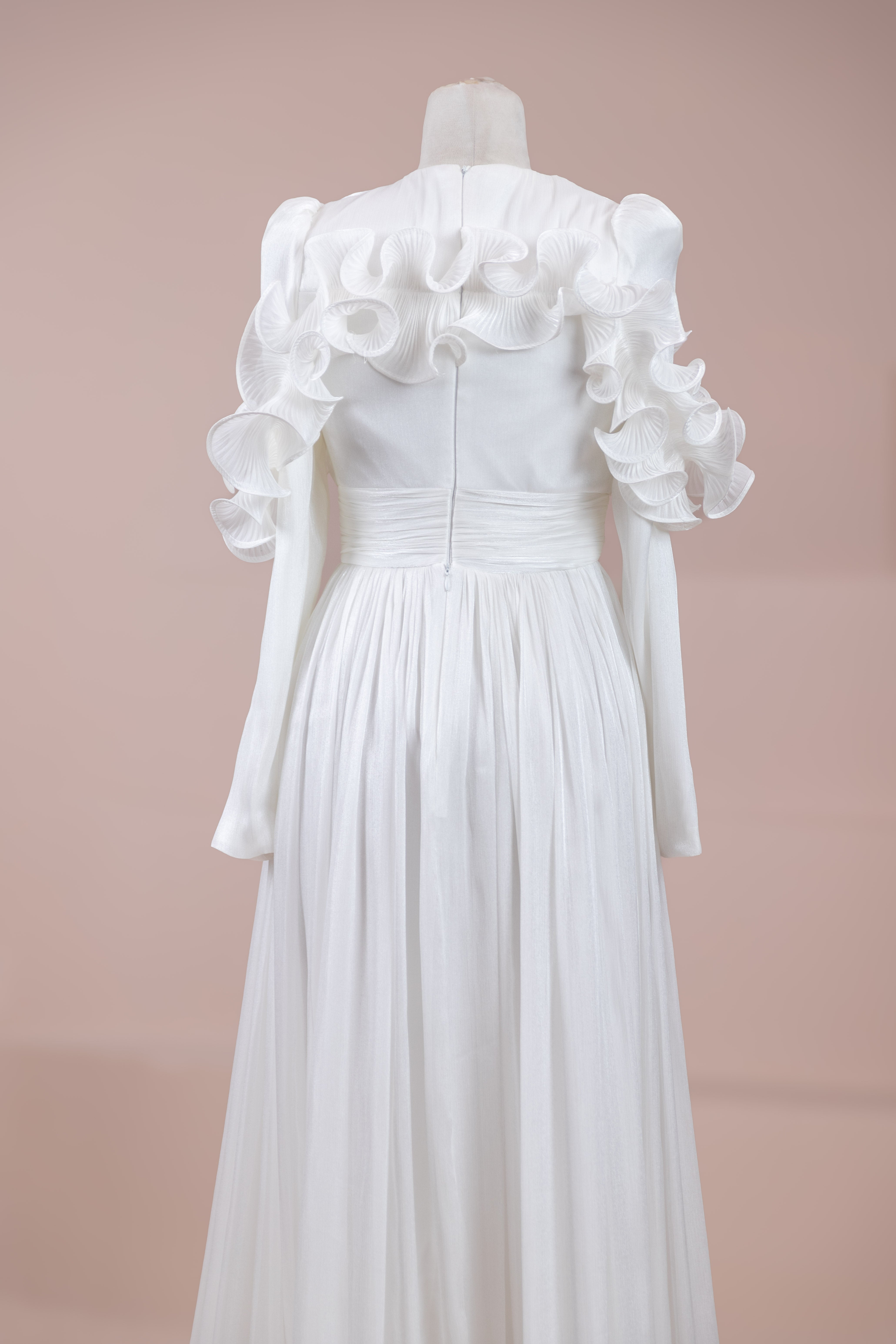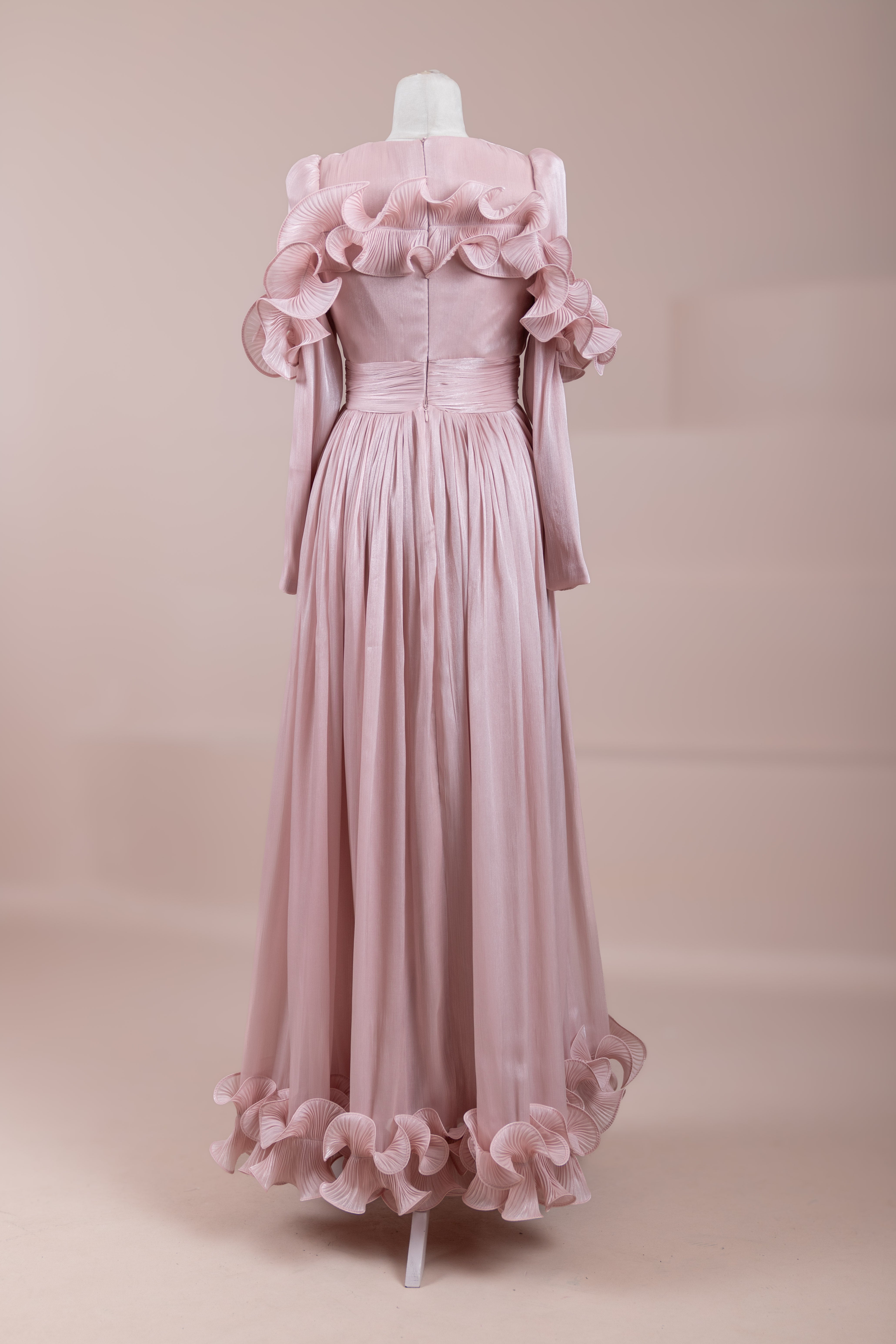 Romantik ve hacimli detaylarıyla öne çıkan bu tasarım, yüksek bel kesimi sayesinde zarif bir silüet oluşturur. Üst bedende ince pile uygulaması bulunurken, bel kısmındaki kuşak formu vücuda dengeli bir oturuş sağlar. Omuz ve etek uçlarında yer alan volan detaylar tasarıma üç boyutlu ve couture bir karakter kazandırır. Uzun ve akışkan etek formu hareketle birlikte güçlü bir duruş sergiler.