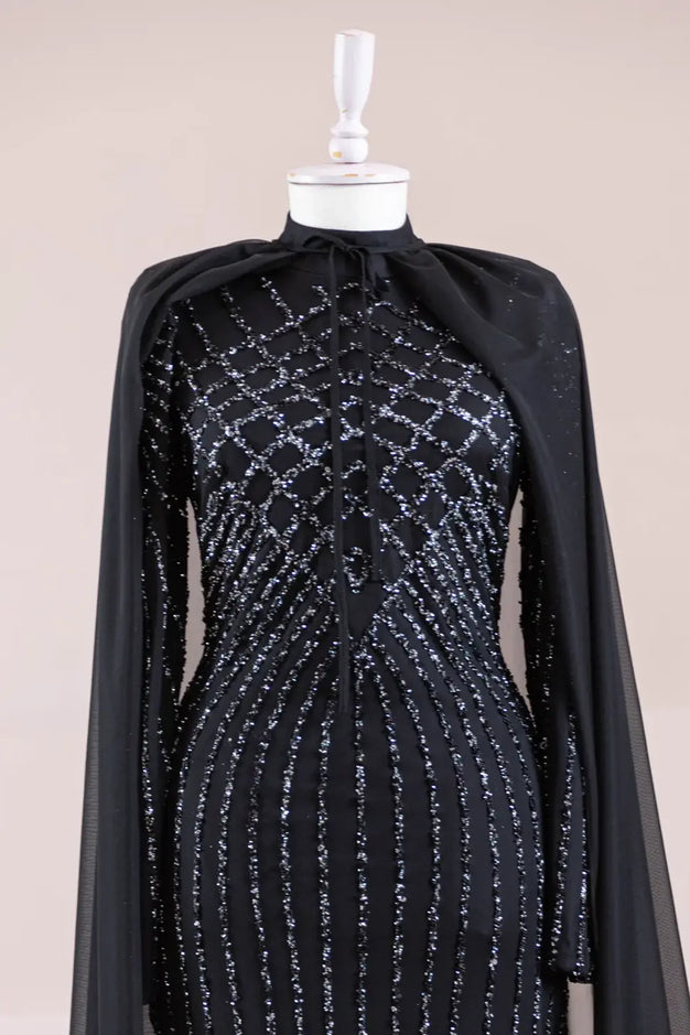 Çıkabilir tül pelerin, ihtiyaca göre görünümü iki farklı stile dönüştürmenizi mümkün kılar: pelerini takarak gece şıklığını artırabilir, çıkararak sade bir görünüm elde edebilirsiniz. Boncuk işleme ise ince bir parlaklık katar ve özel davetlerde zarafeti öne çıkarır.