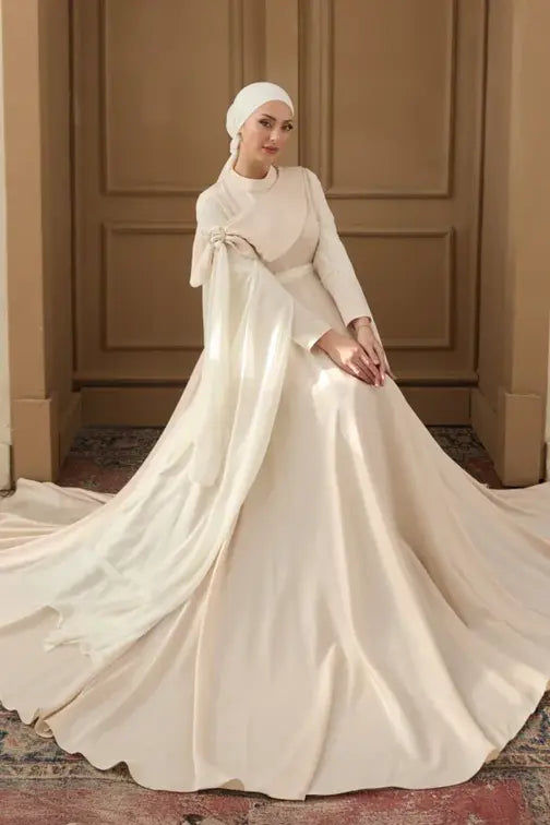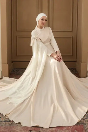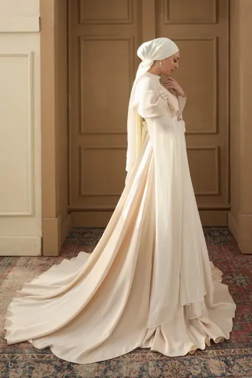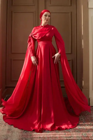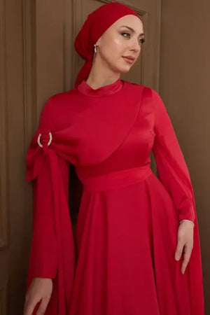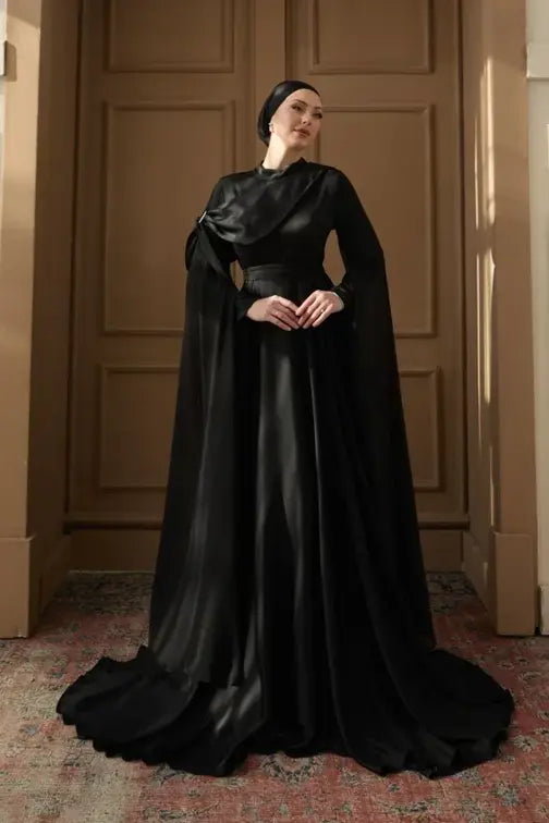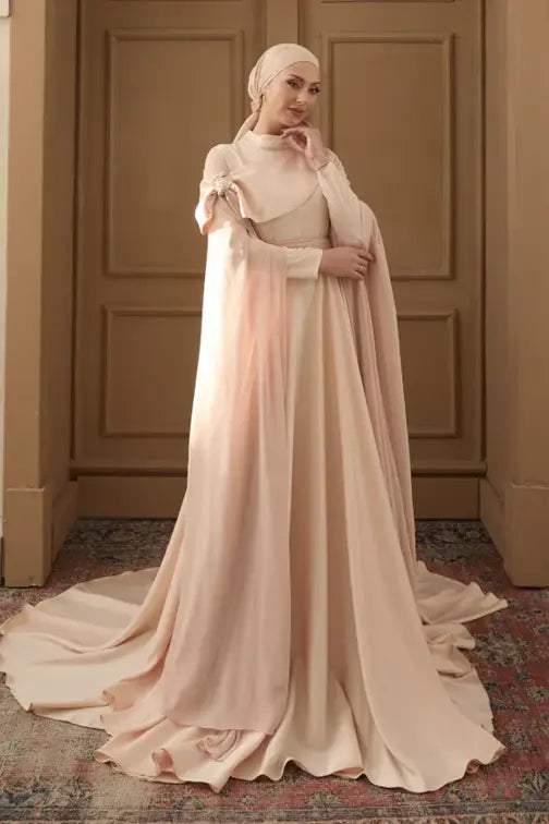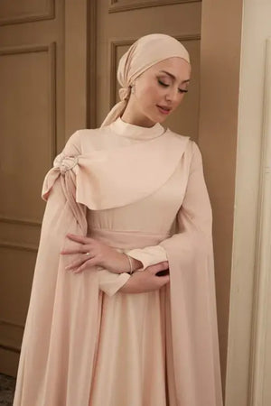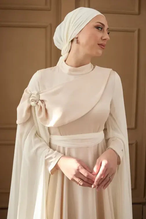 Modest bir tasarım ve zarafeti bir araya getirerek özel günlerde güvenli ve şık bir görünüm sağlar. Kollarda pelerin ve omuzlarda taşlı detaylar, ışık altında hafif parıltı vererek davet havasını güçlendirir. Akıcı krep saten kumaş, hareket özgürlüğünü korurken sofistike bir siluet yaratır.
