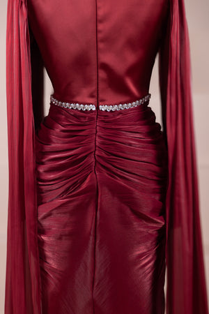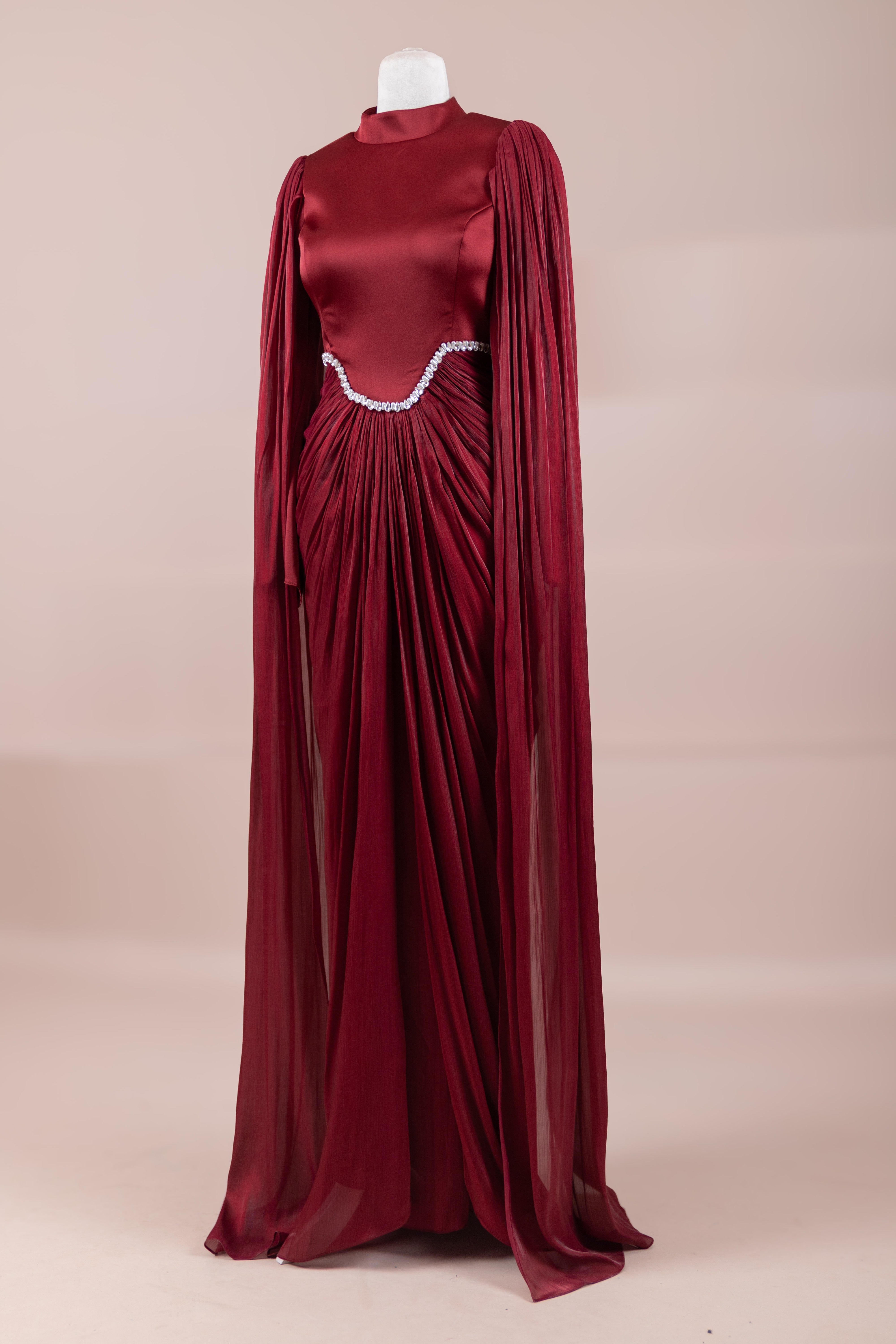 - Detaylar: Belde taş detayı, omuzdan pelerin
