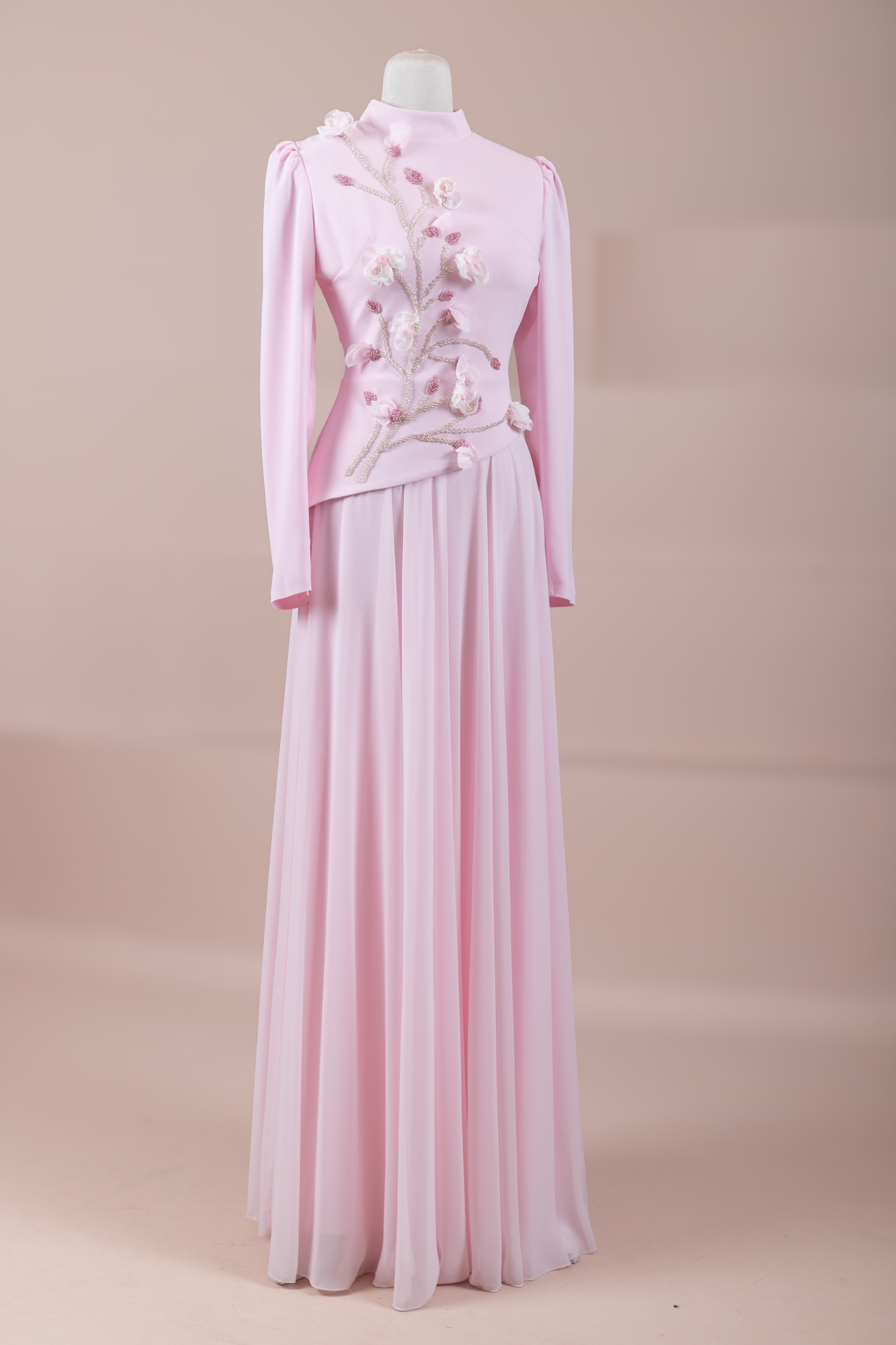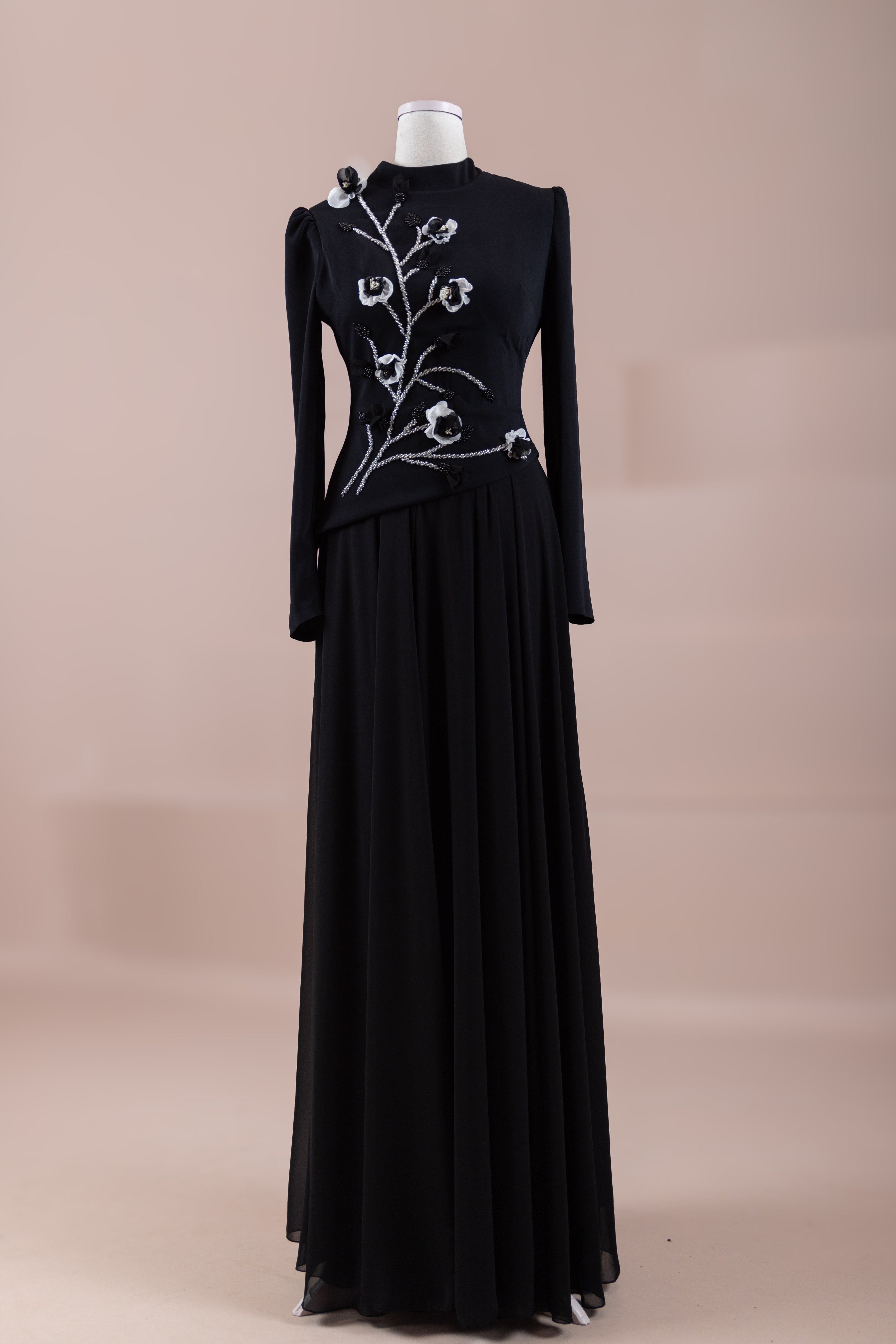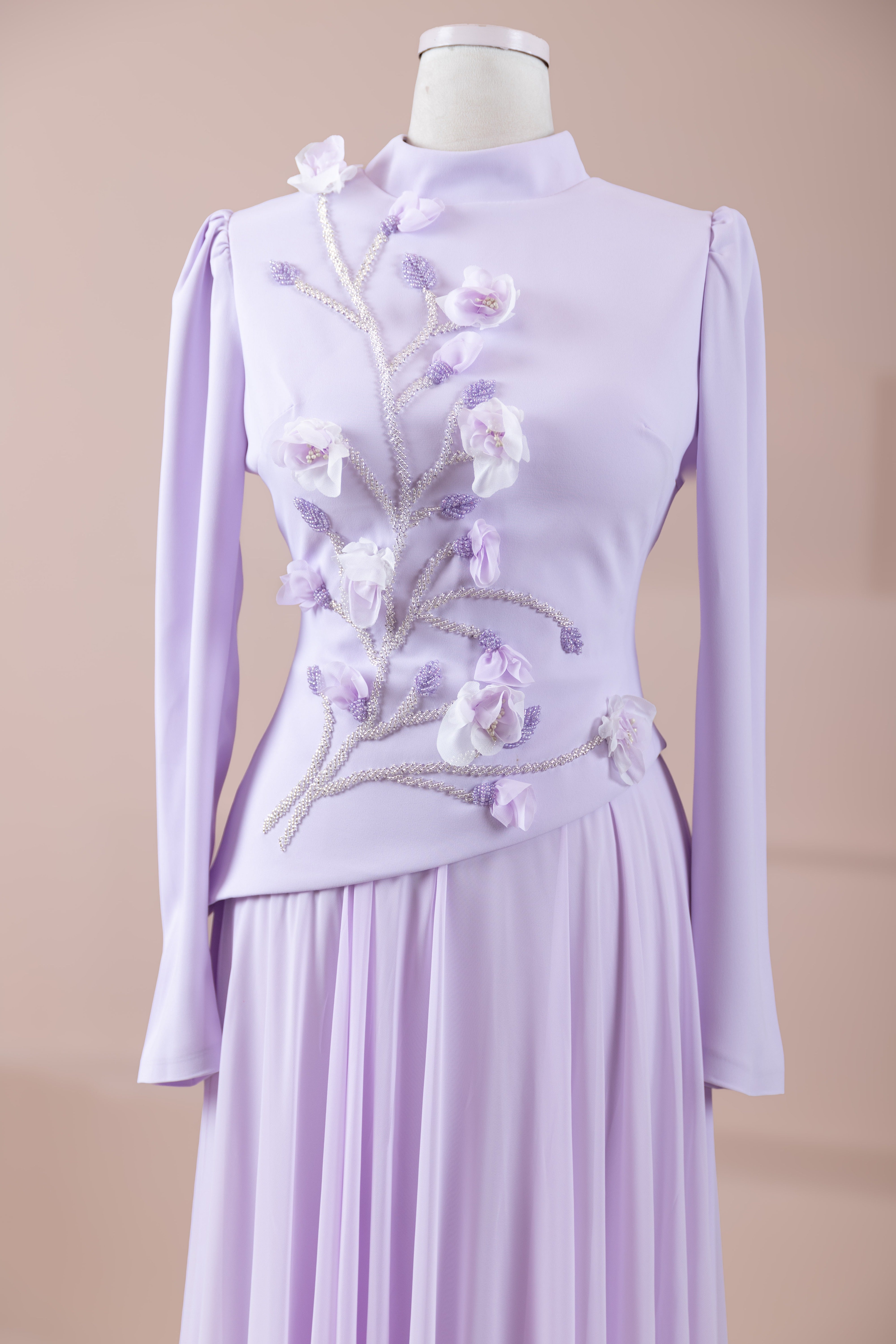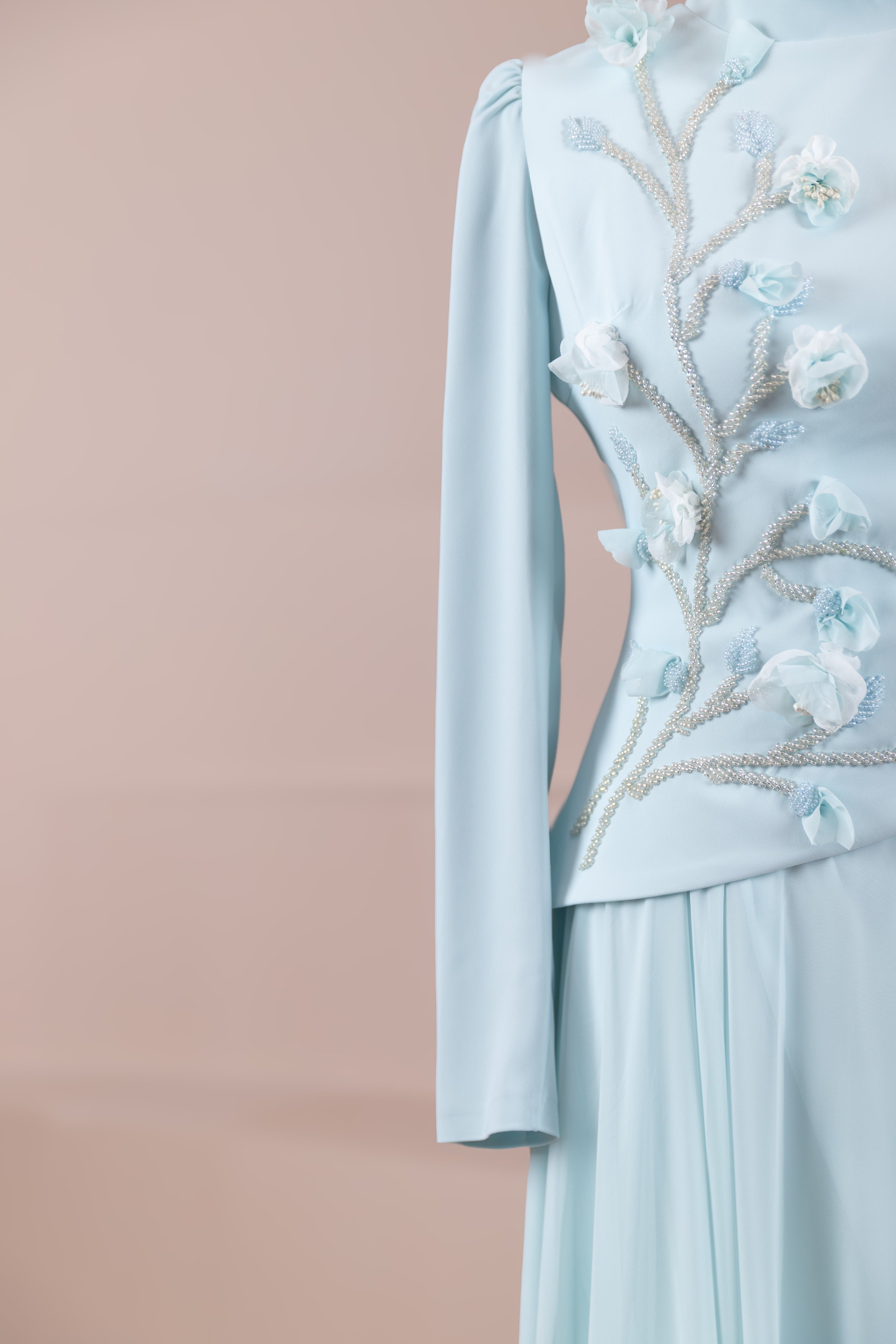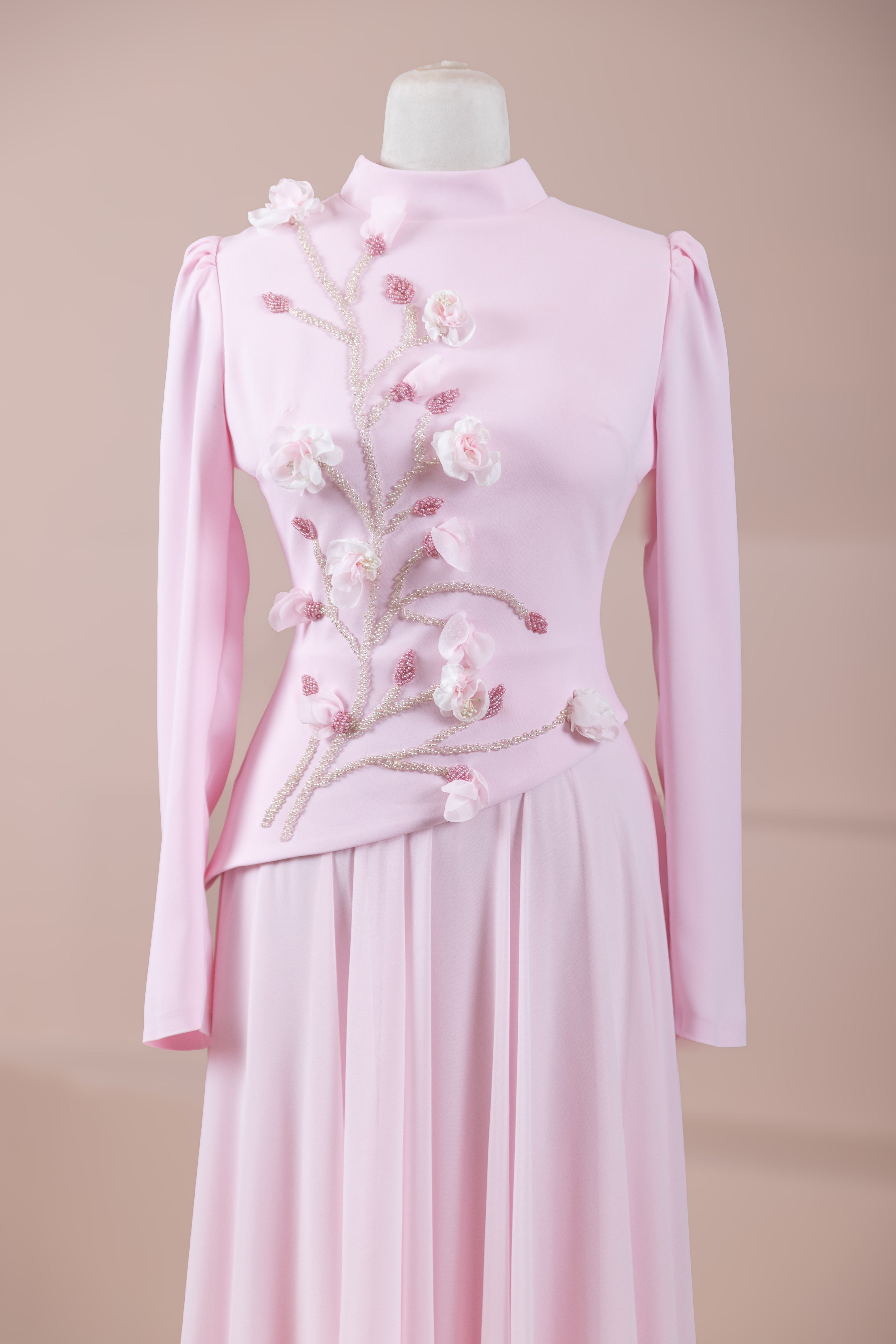 – Göğüs ve bel hattında zarif çiçek motifli işlemeler