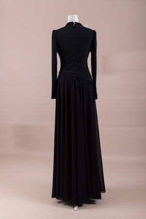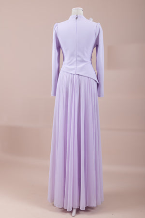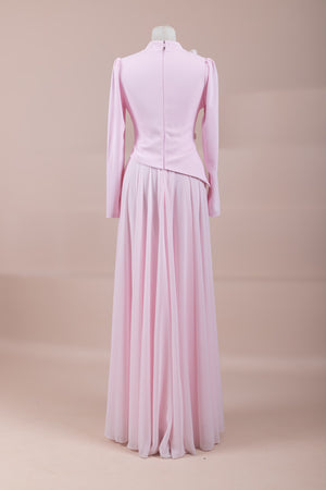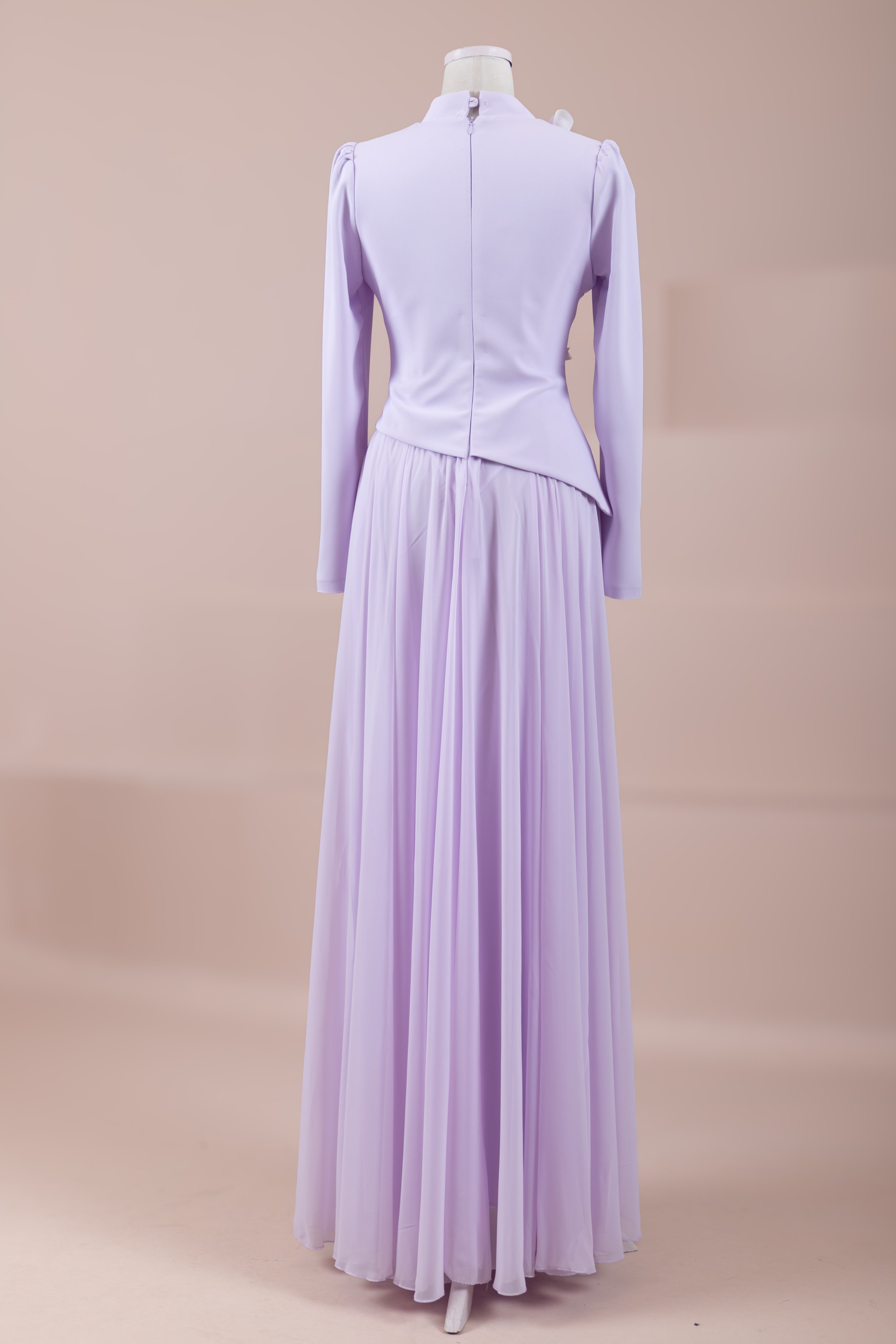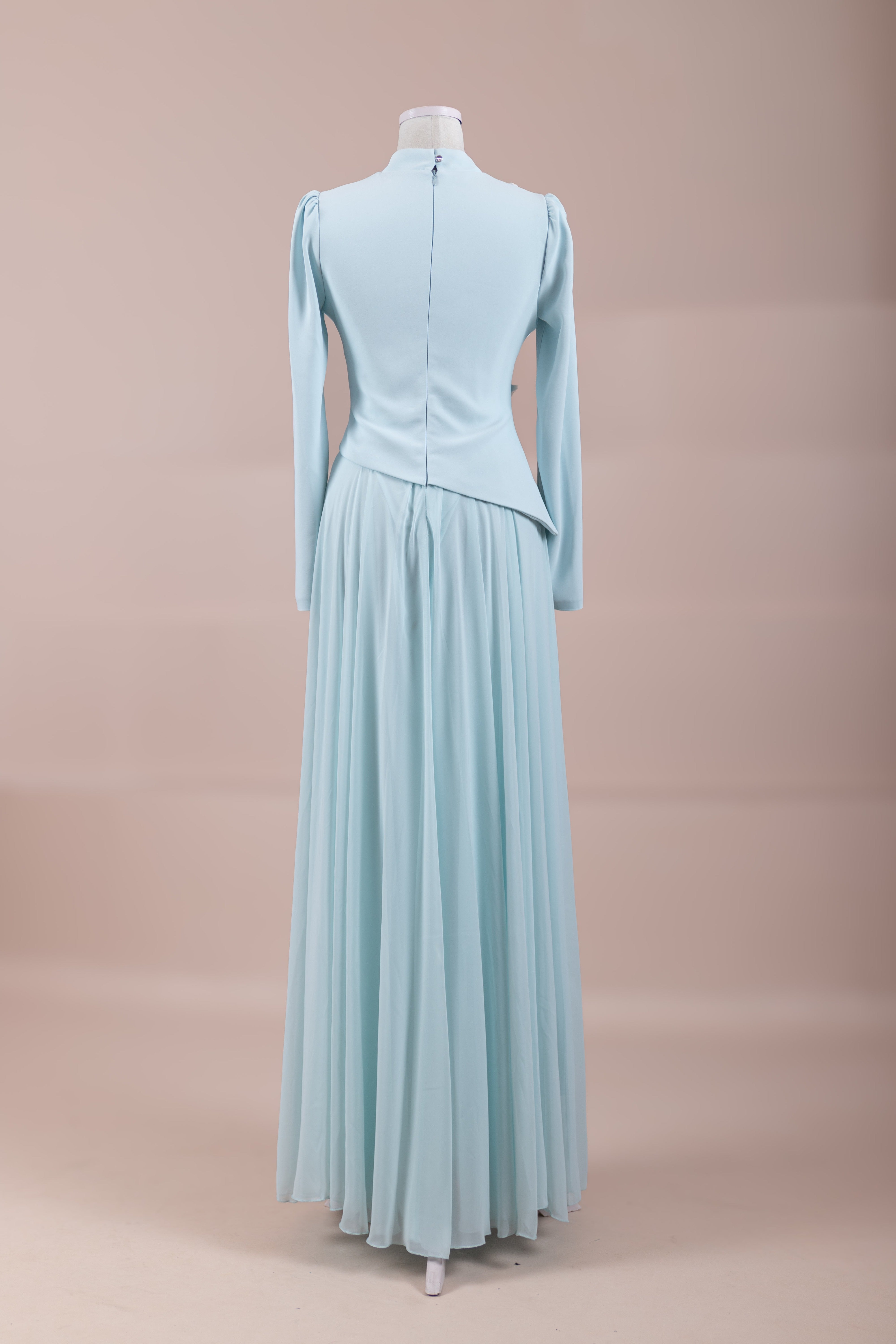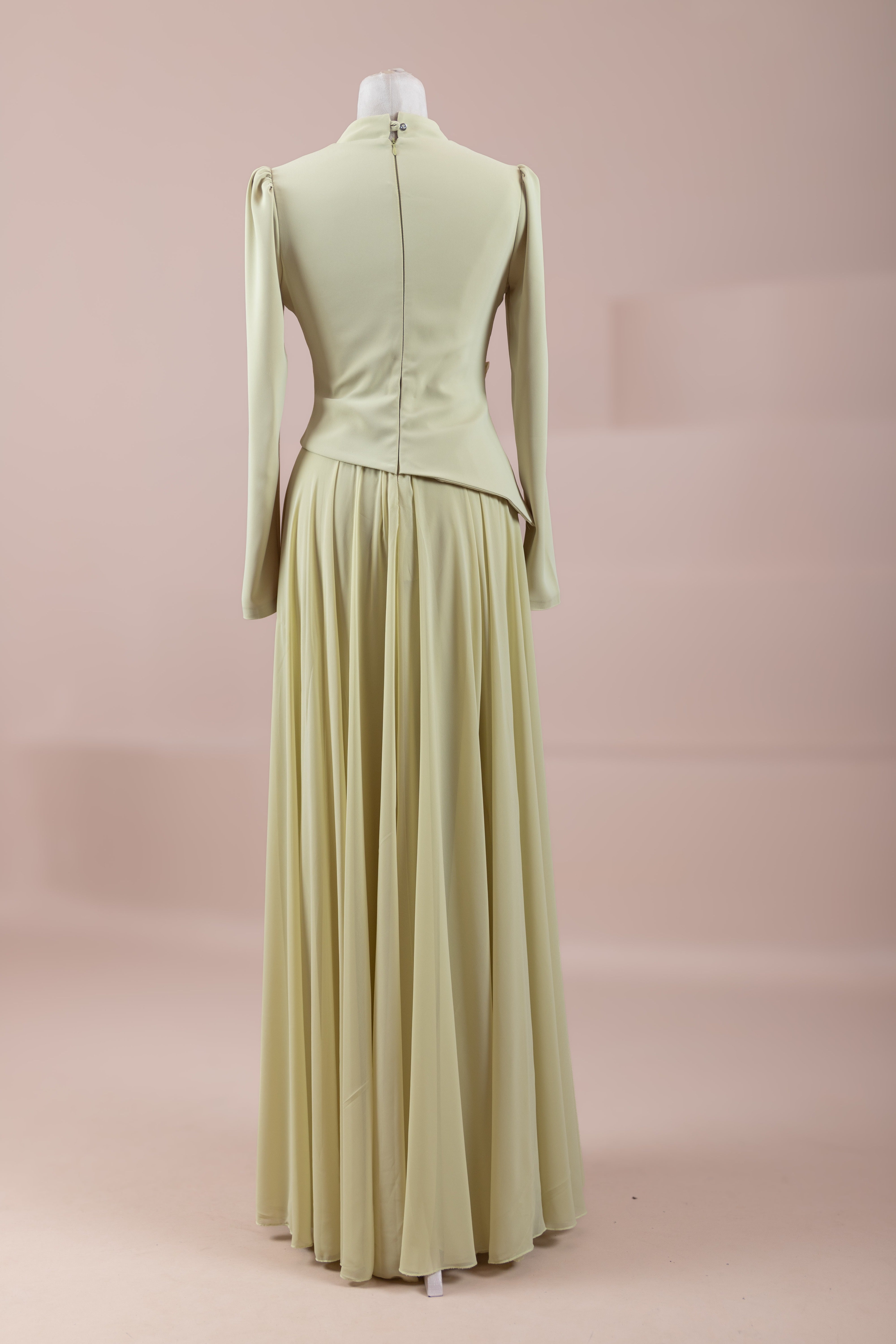 Üst beden vücuda oturan slim fit kesimdedir. Bel hattı hafif asimetrik formda tasarlanmış olup alt kısım belden aşağı dökümlü ve A-kesim etek yapısına sahiptir. Maksi boy uzunluğu ile zarif ve dengeli bir siluet sunar. Omuzlarda hafif yapılandırılmış form mevcuttur.
