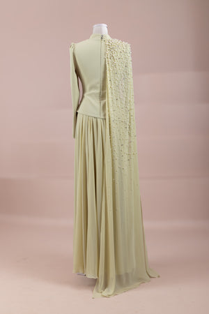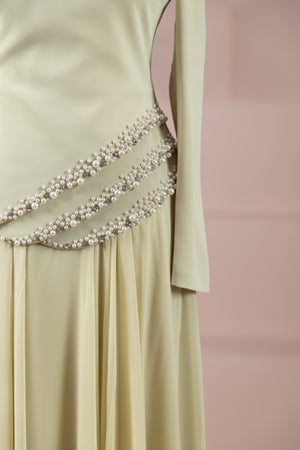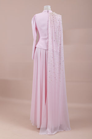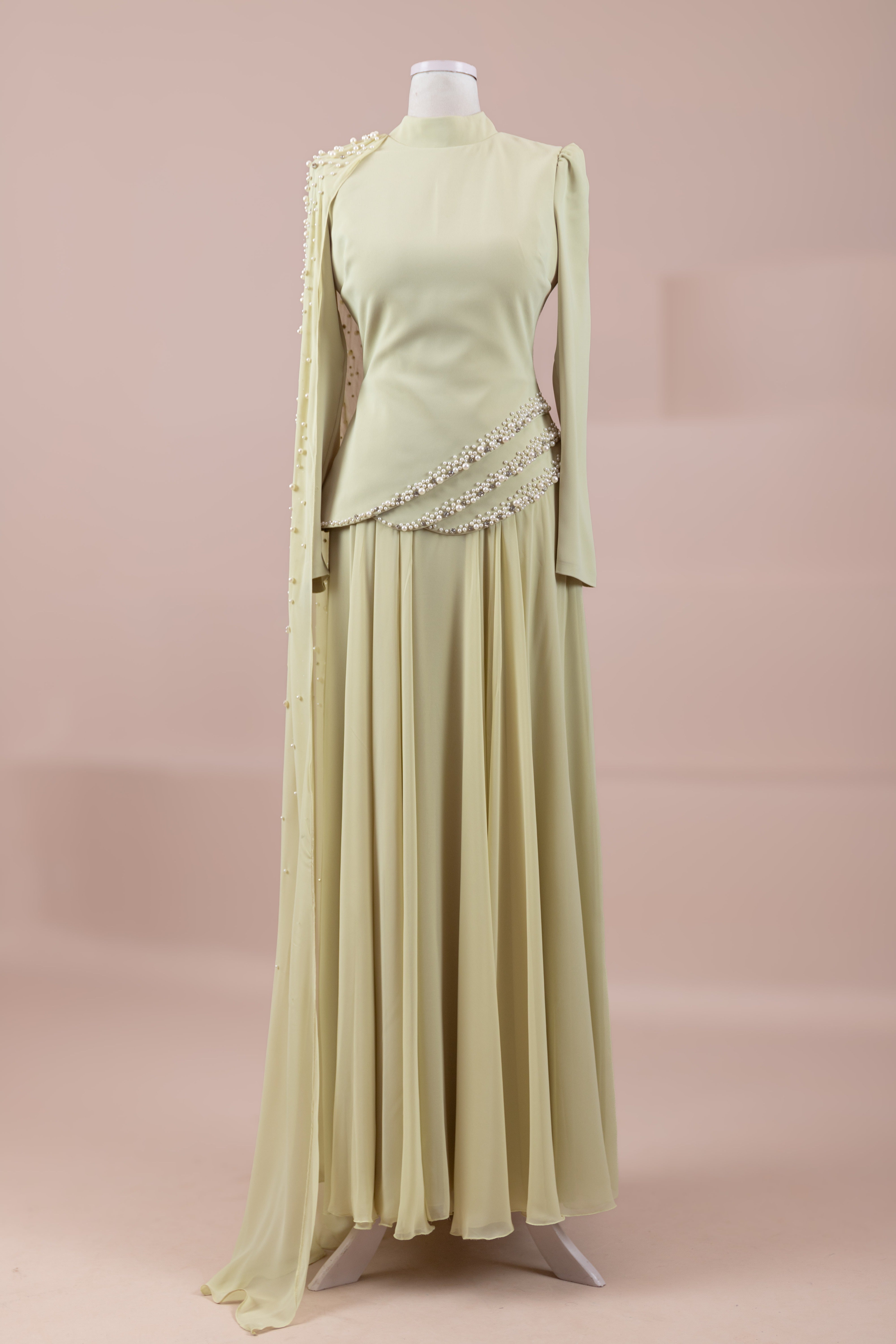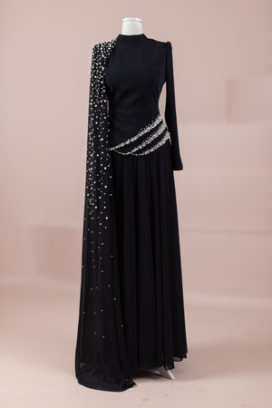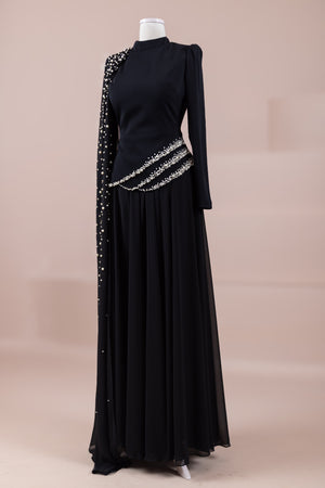 Üst kısmı vücuda oturan slim fit kesime sahiptir. Belden aşağı doğru dökümlü ve bol kesim (A form) etek yapısı ile rahat ve zarif bir siluet sunar. Tek kol tasarımı asimetrik bir görünüm kazandırır. Maksi boydur.