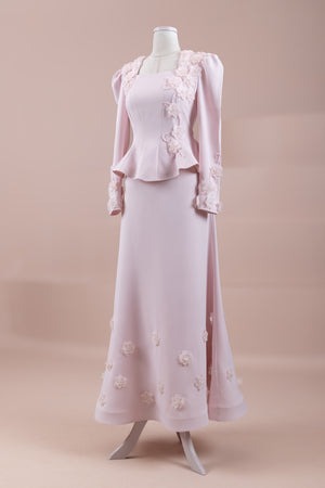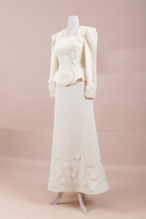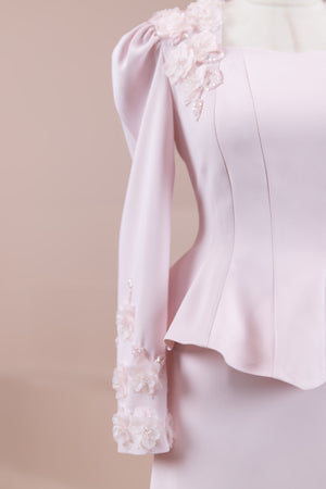 Üst beden vücuda oturan slim fit kesimdedir. Bel hattında yer alan peplum form, bele zarif bir hacim kazandırarak feminen bir siluet oluşturur. Etek kısmı belden aşağı hafif açılan A-kesim formda tasarlanmış olup maksi boy uzunluğa sahiptir. Omuzlarda hafif balon form mevcuttur.