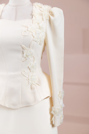 – Göğüs ve bel hattında zarif dantel ve çiçek motifli aplikeler