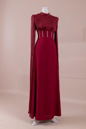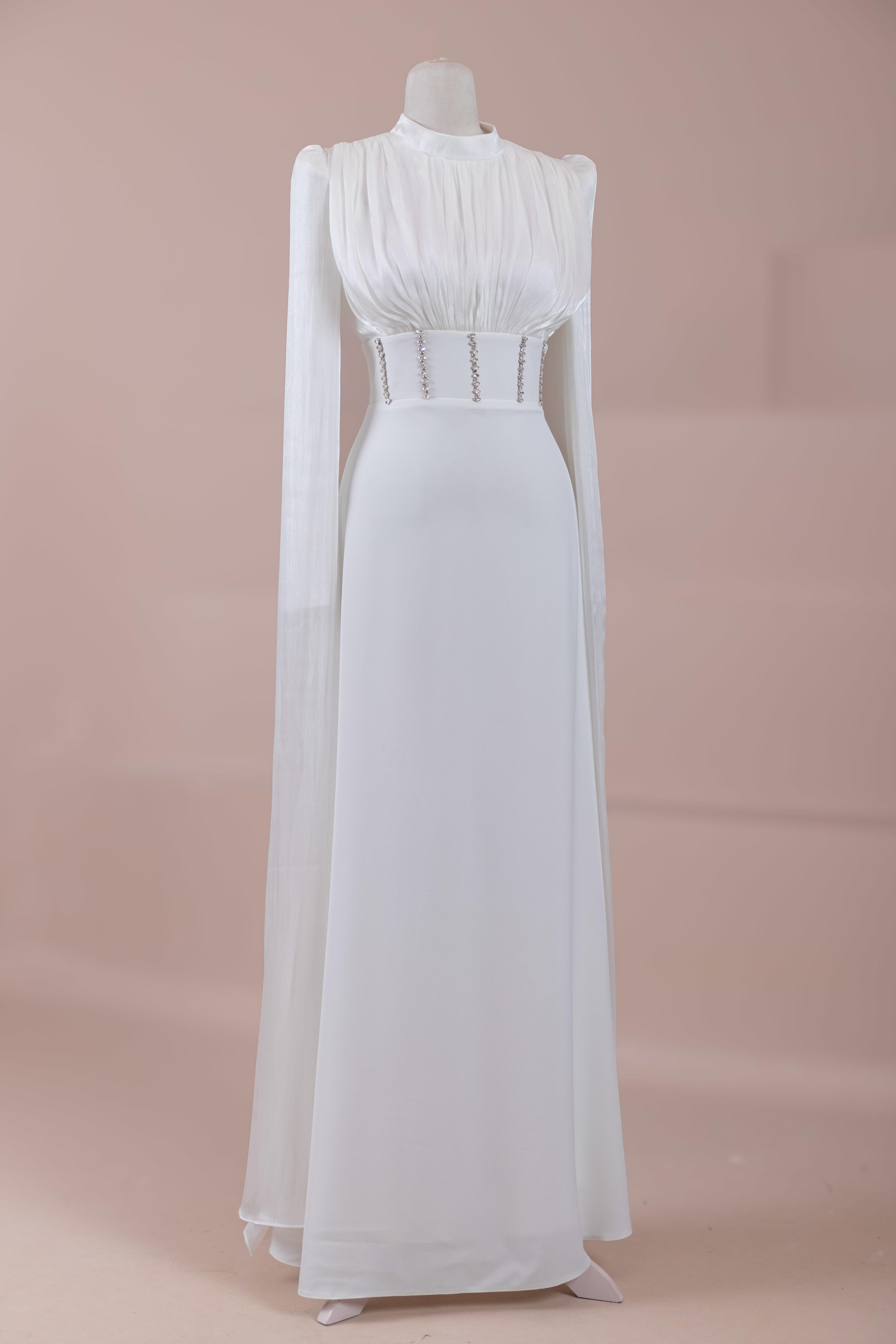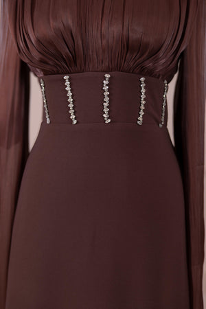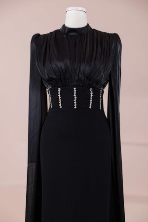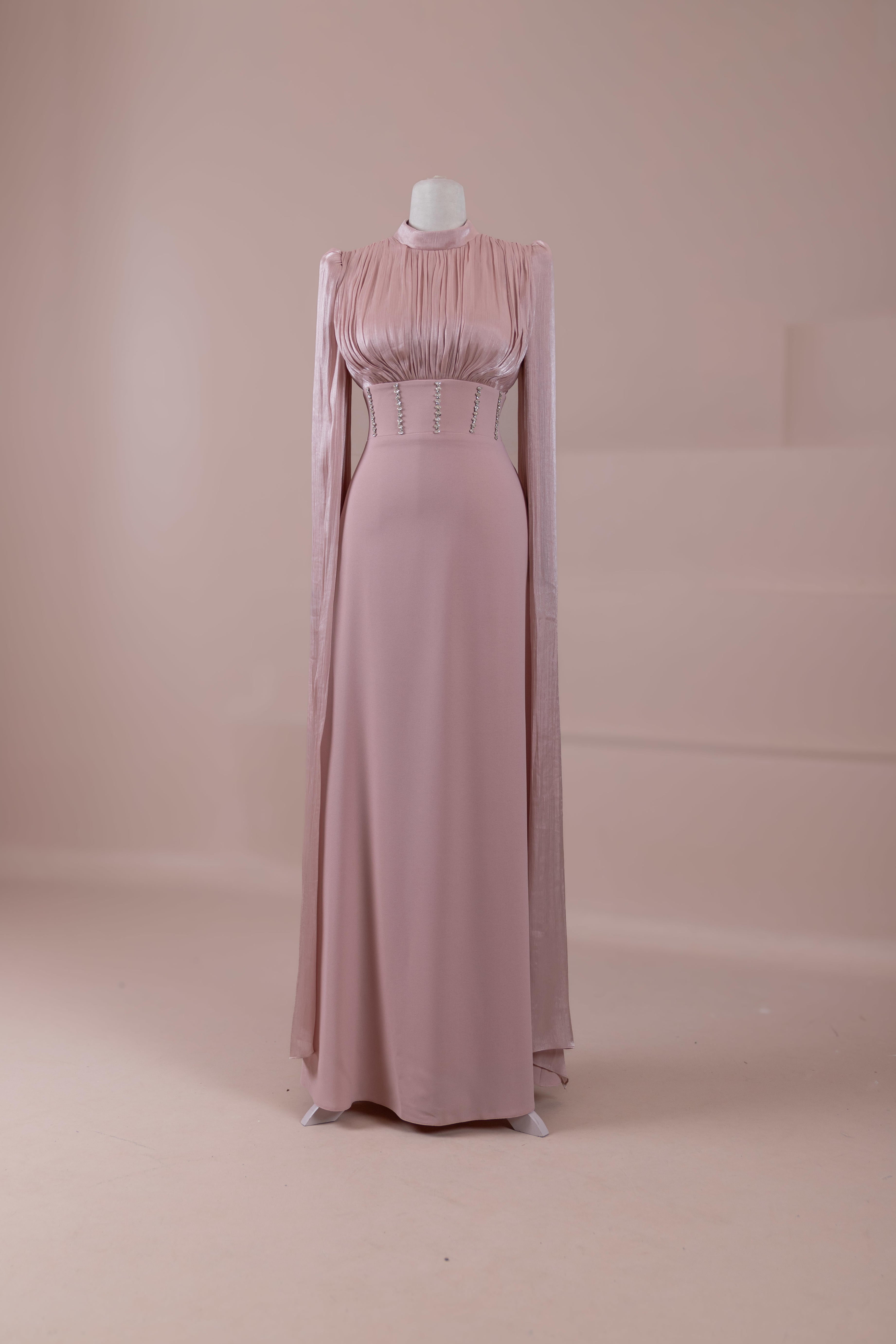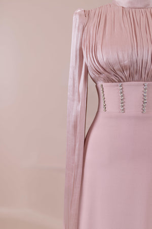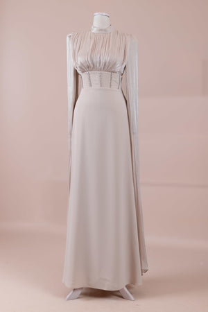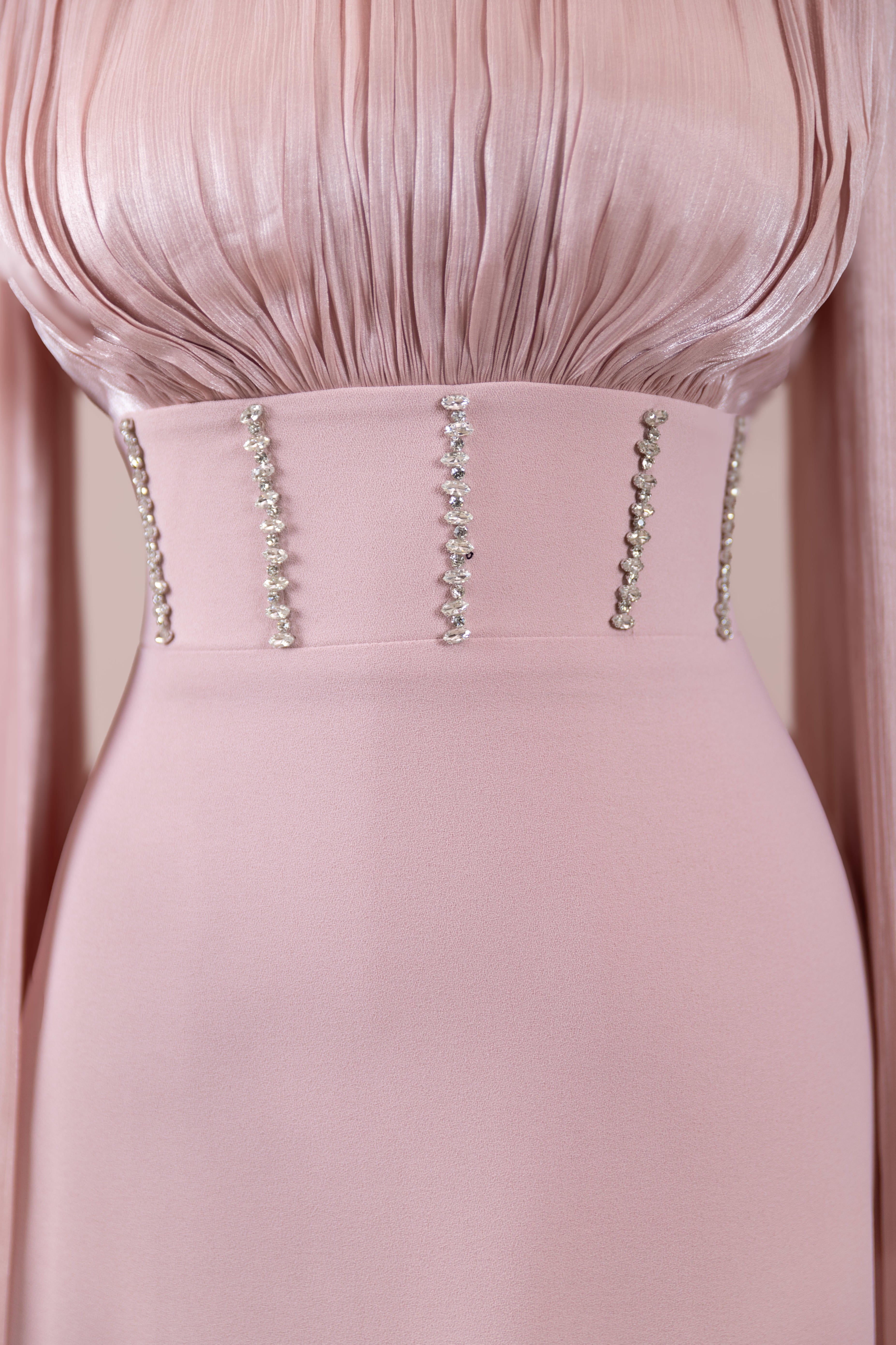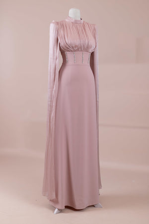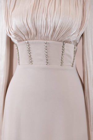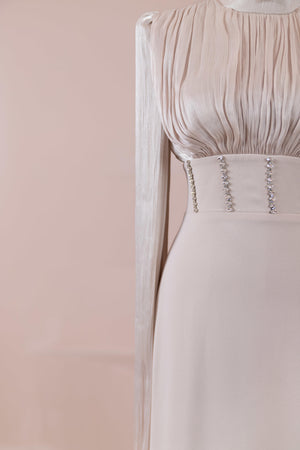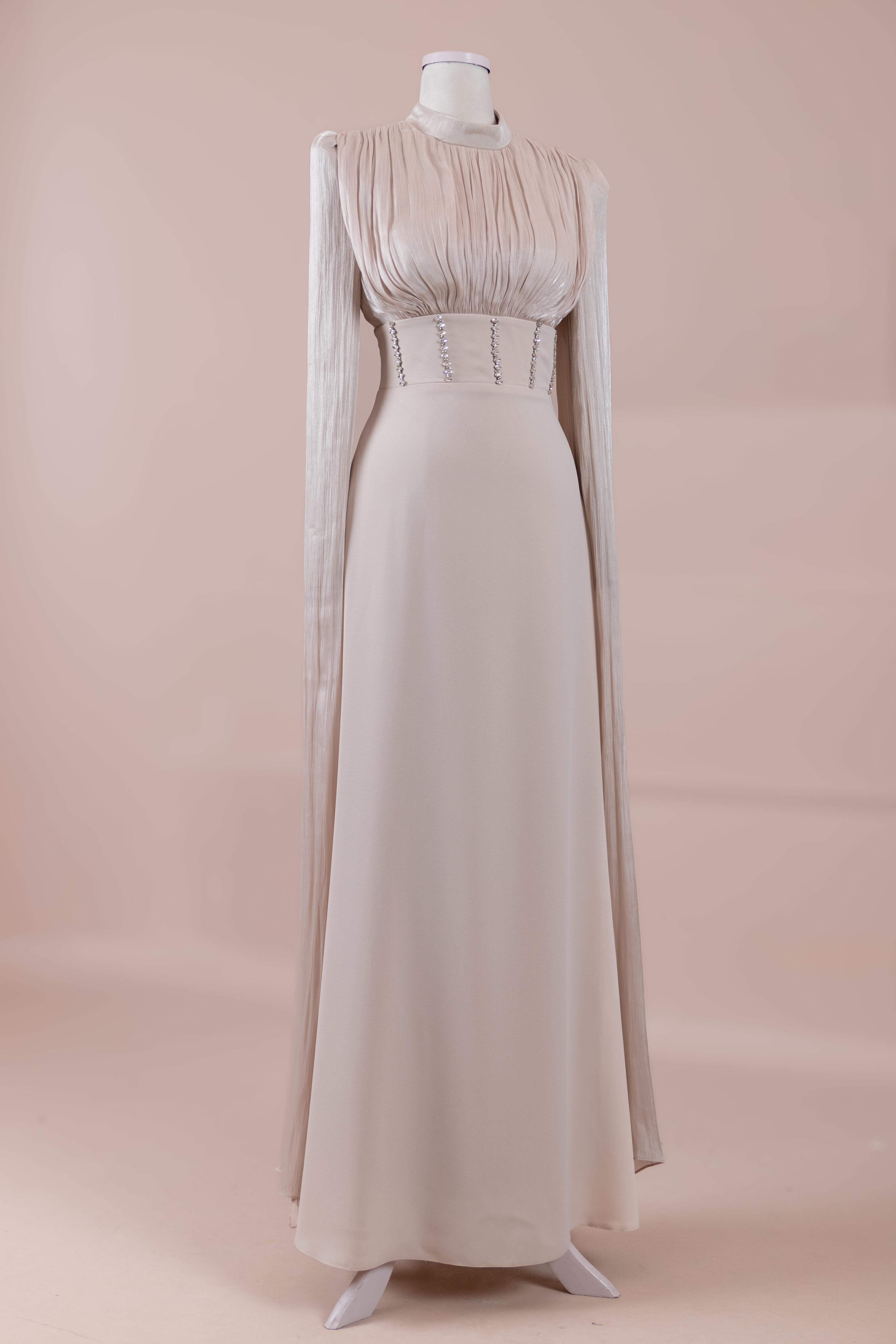 Model, yüksek bel vurgulu ve yere kadar uzanan düz/A-line silüet üzerine kurgulanmıştır. Etek formu kalça hattından itibaren kontrollü şekilde genişler ve zemine doğru akışkan bir düşüş sağlar. Üst bedende omuzdan başlayan yoğun pile ve drape çalışması göğüs hattında hacim oluşturur, belde ise geniş bir kemer formu ile net şekilde toparlanır. Bel bandı vücudu kavrayarak silüeti dengeler ve üstteki hacmi alt gövdeyle orantılar. Uzun ve düz kol yapısı tasarıma dikey bir akış kazandırır.