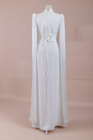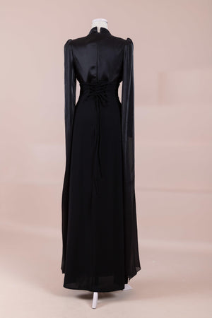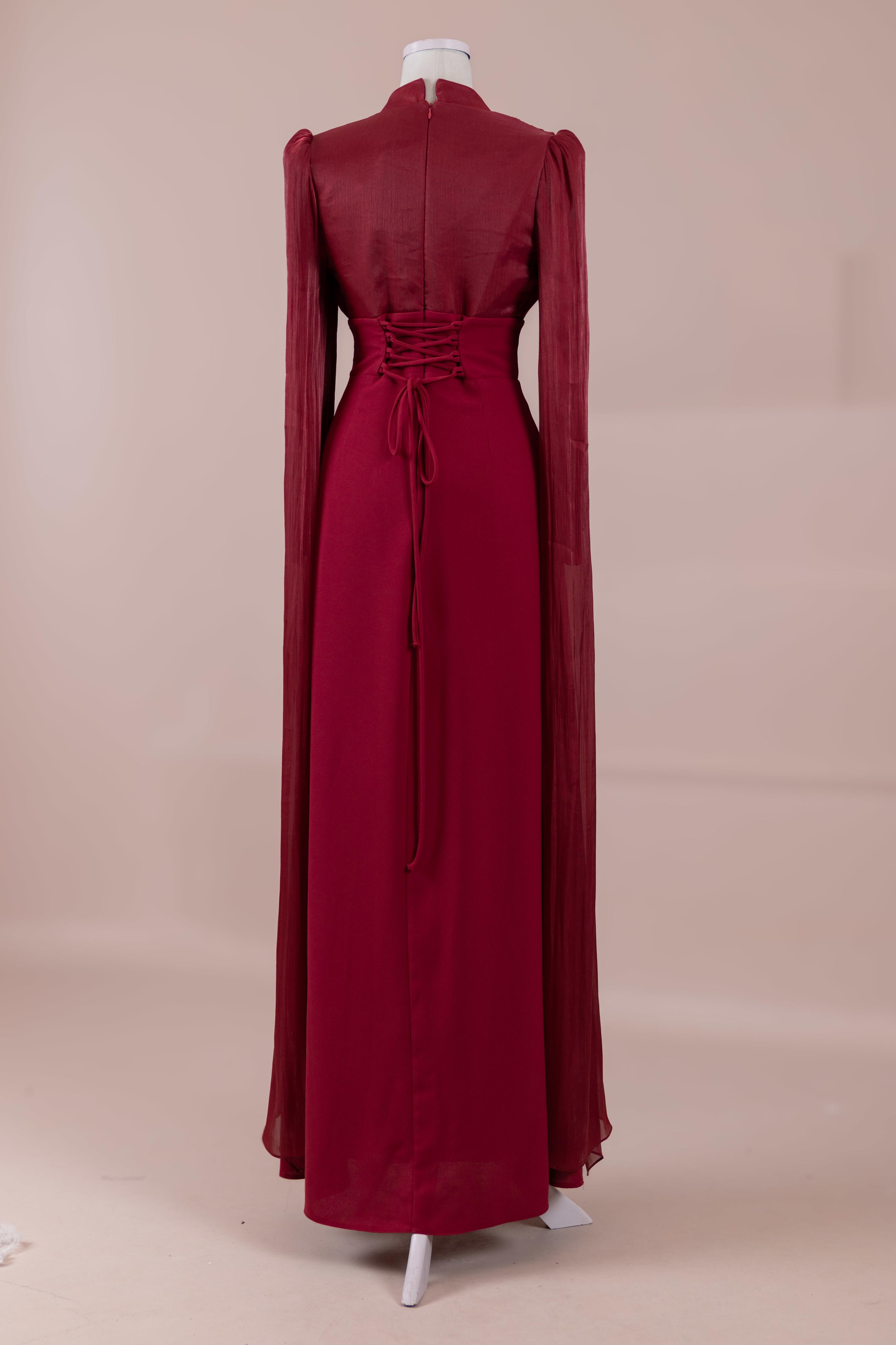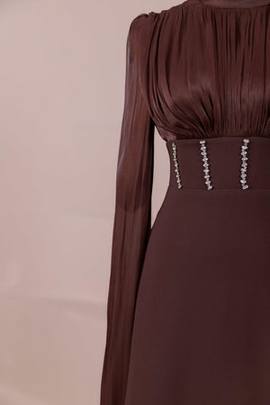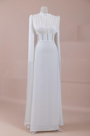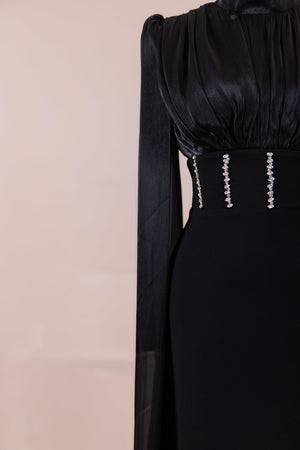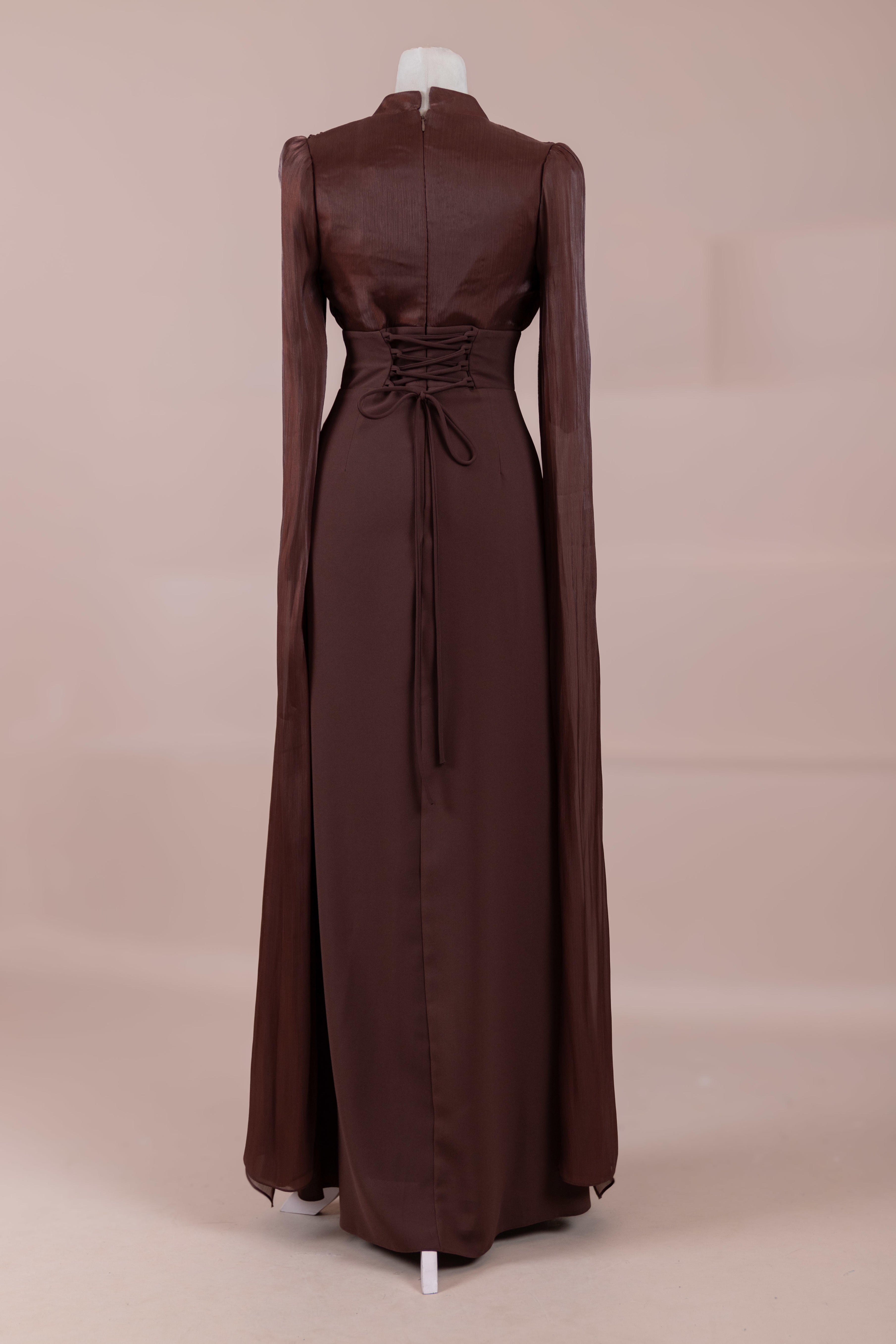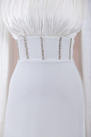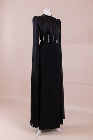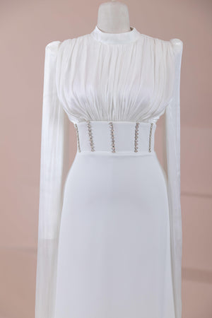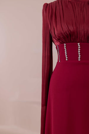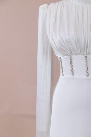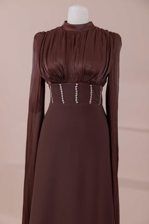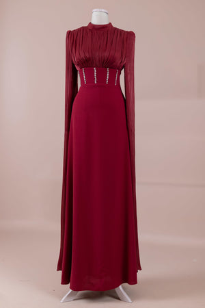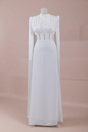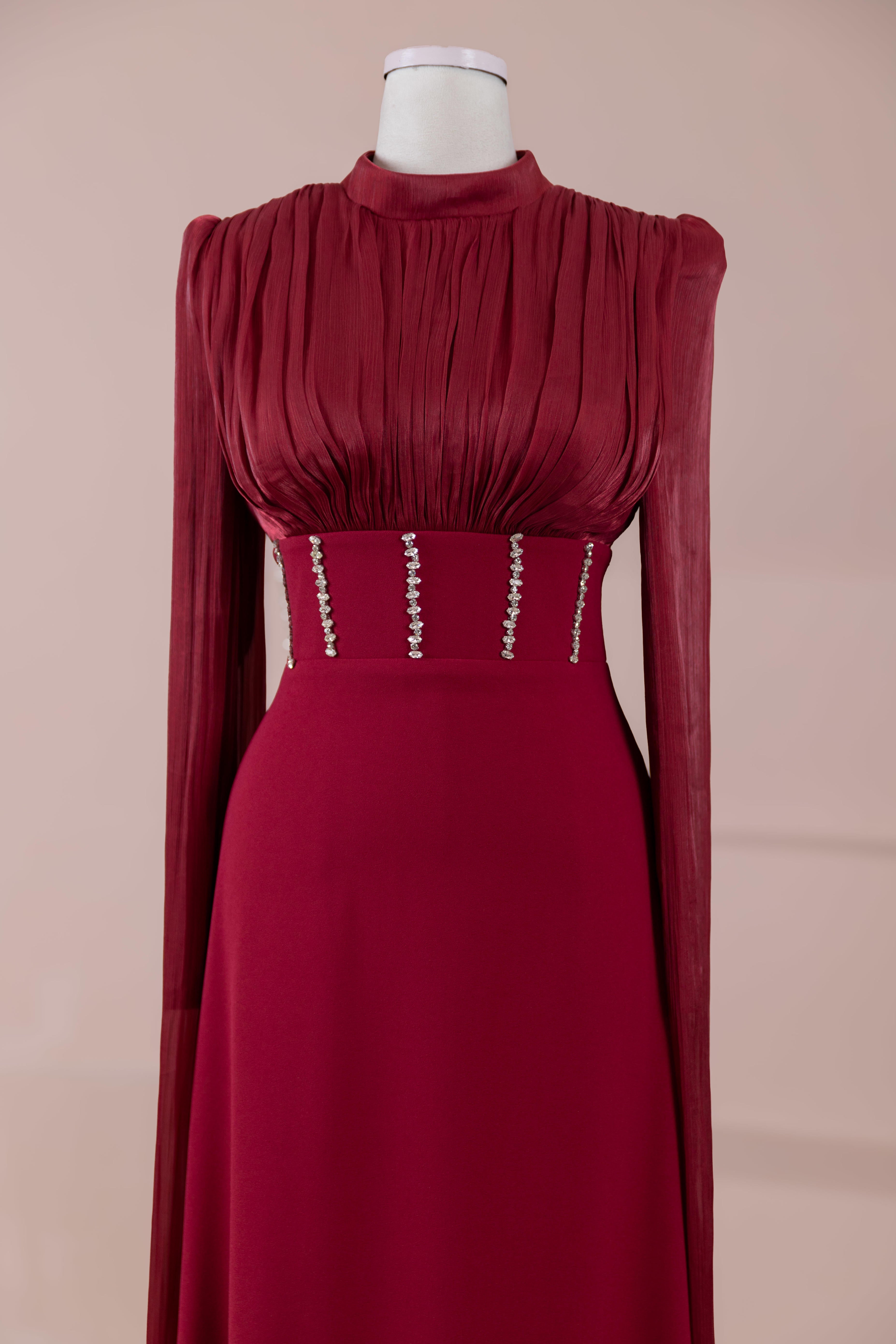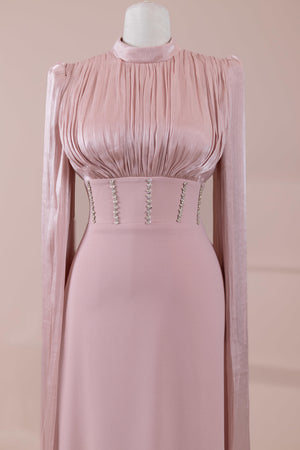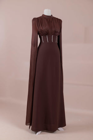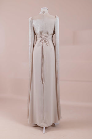 Model, yüksek bel vurgulu ve yere kadar uzanan düz/A-line silüet üzerine kurgulanmıştır. Etek formu kalça hattından itibaren kontrollü şekilde genişler ve zemine doğru akışkan bir düşüş sağlar. Üst bedende omuzdan başlayan yoğun pile ve drape çalışması göğüs hattında hacim oluşturur, belde ise geniş bir kemer formu ile net şekilde toparlanır. Bel bandı vücudu kavrayarak silüeti dengeler ve üstteki hacmi alt gövdeyle orantılar. Uzun ve düz kol yapısı tasarıma dikey bir akış kazandırır.