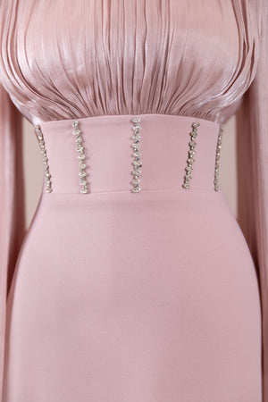 • Bel bandı üzerinde dikey yerleştirilmiş taş/aksesuar şerit detayları