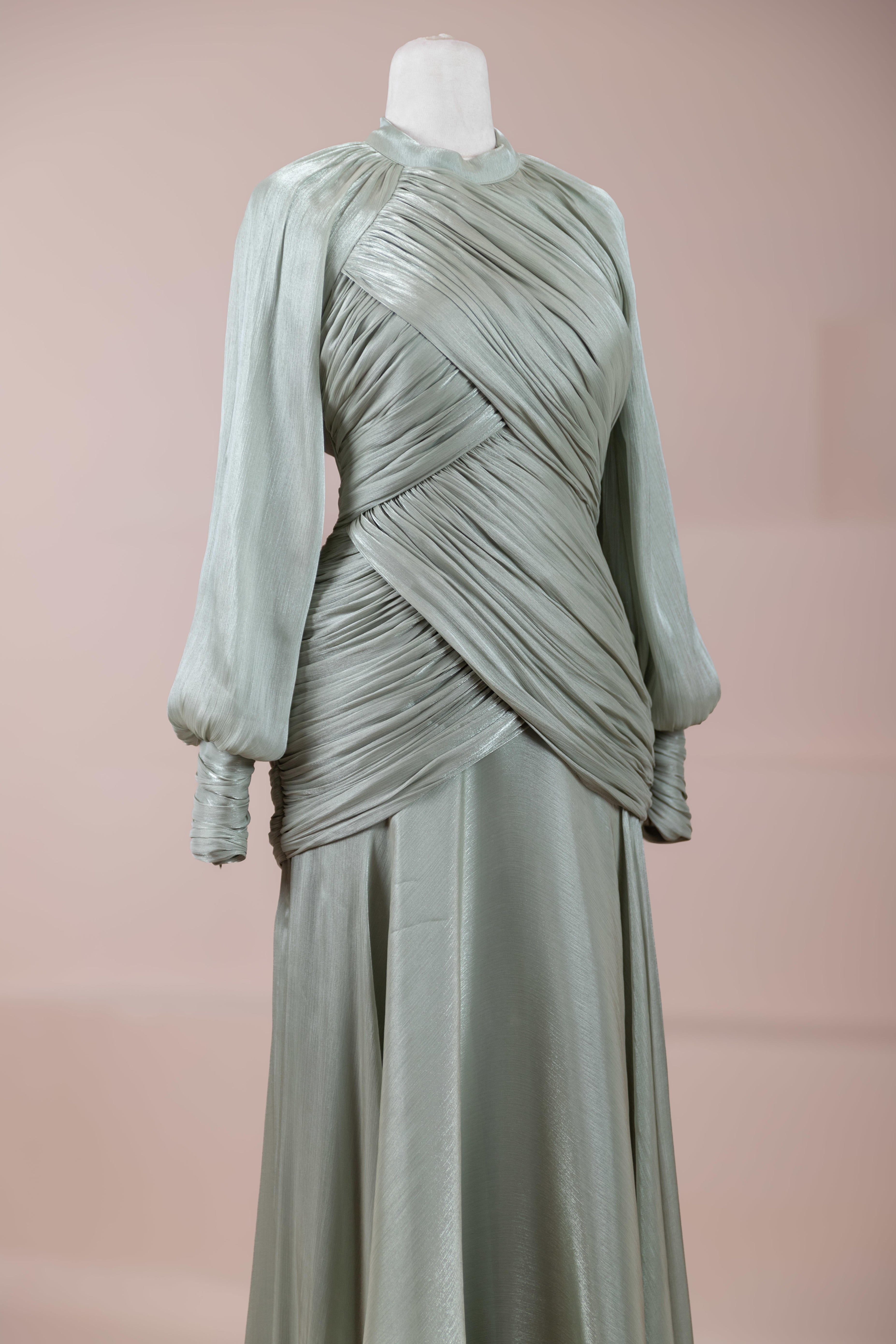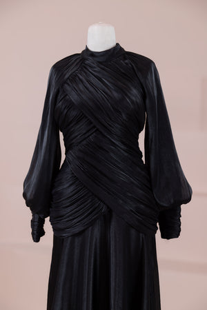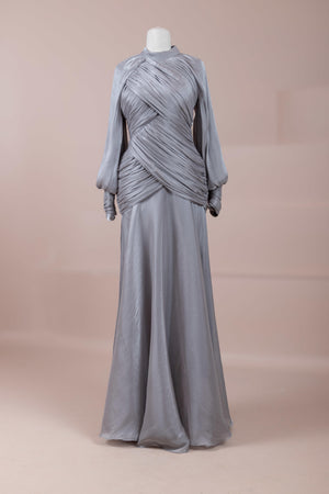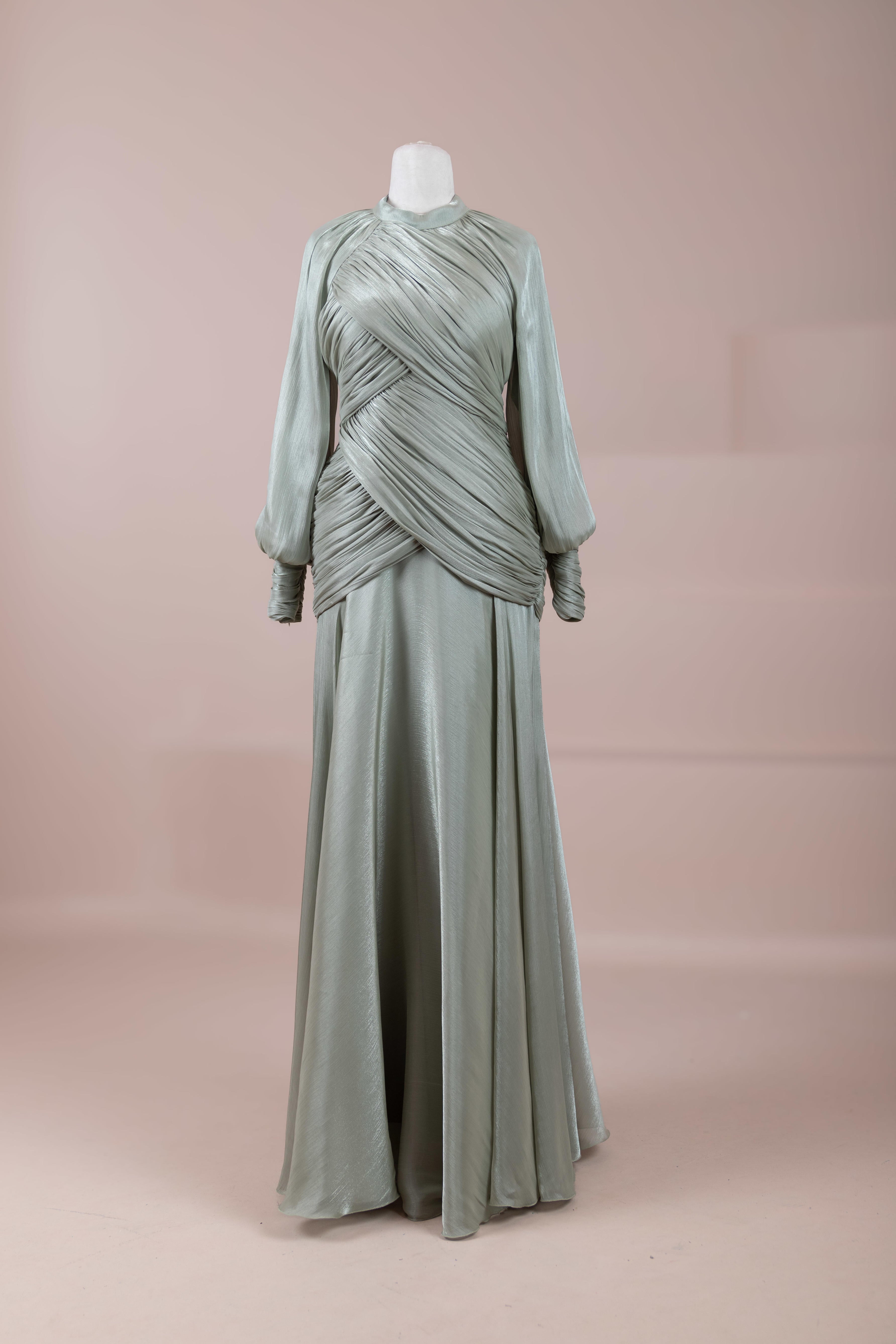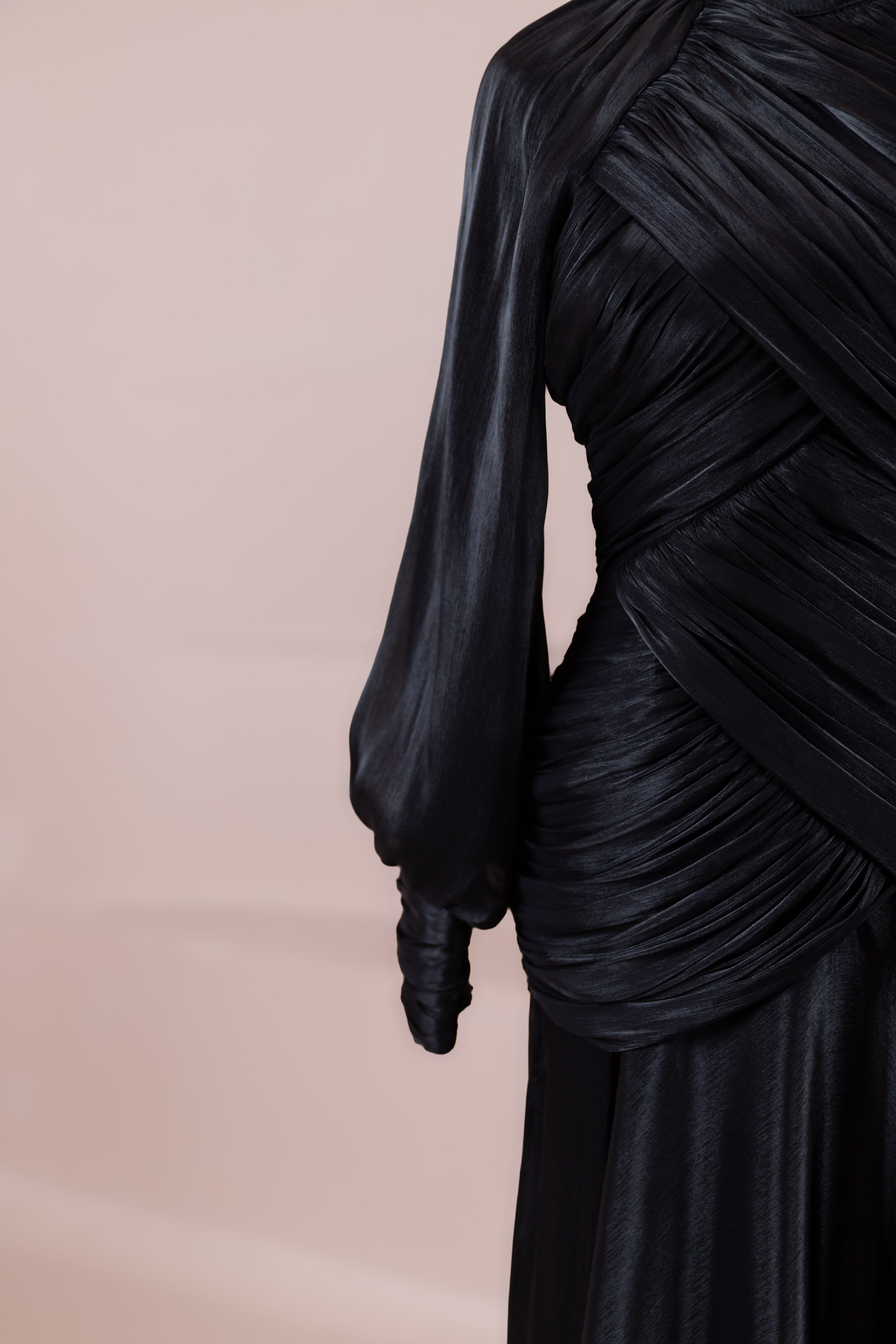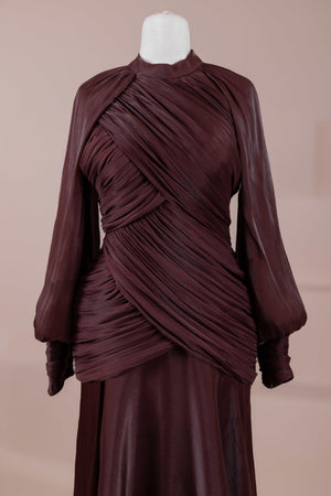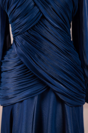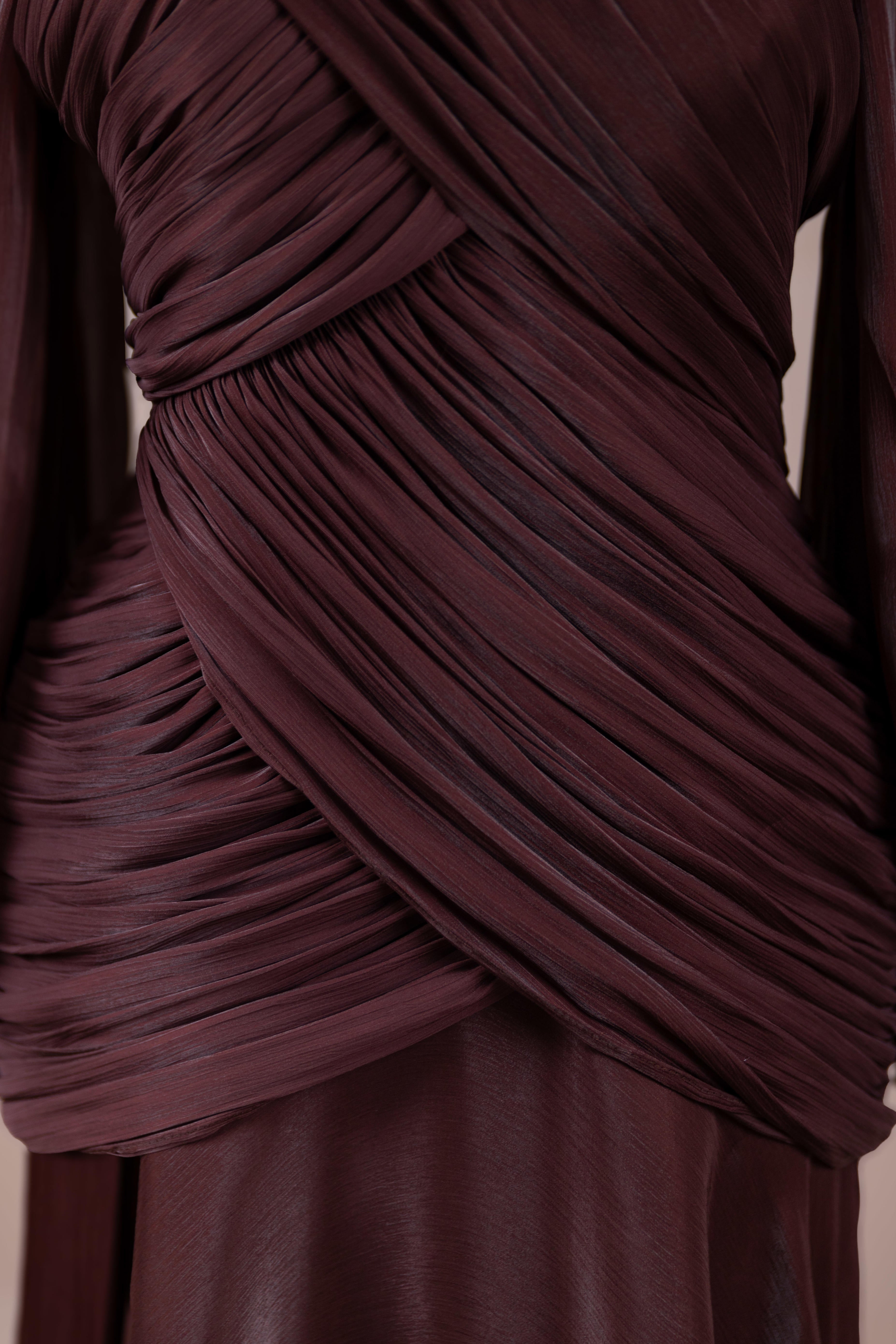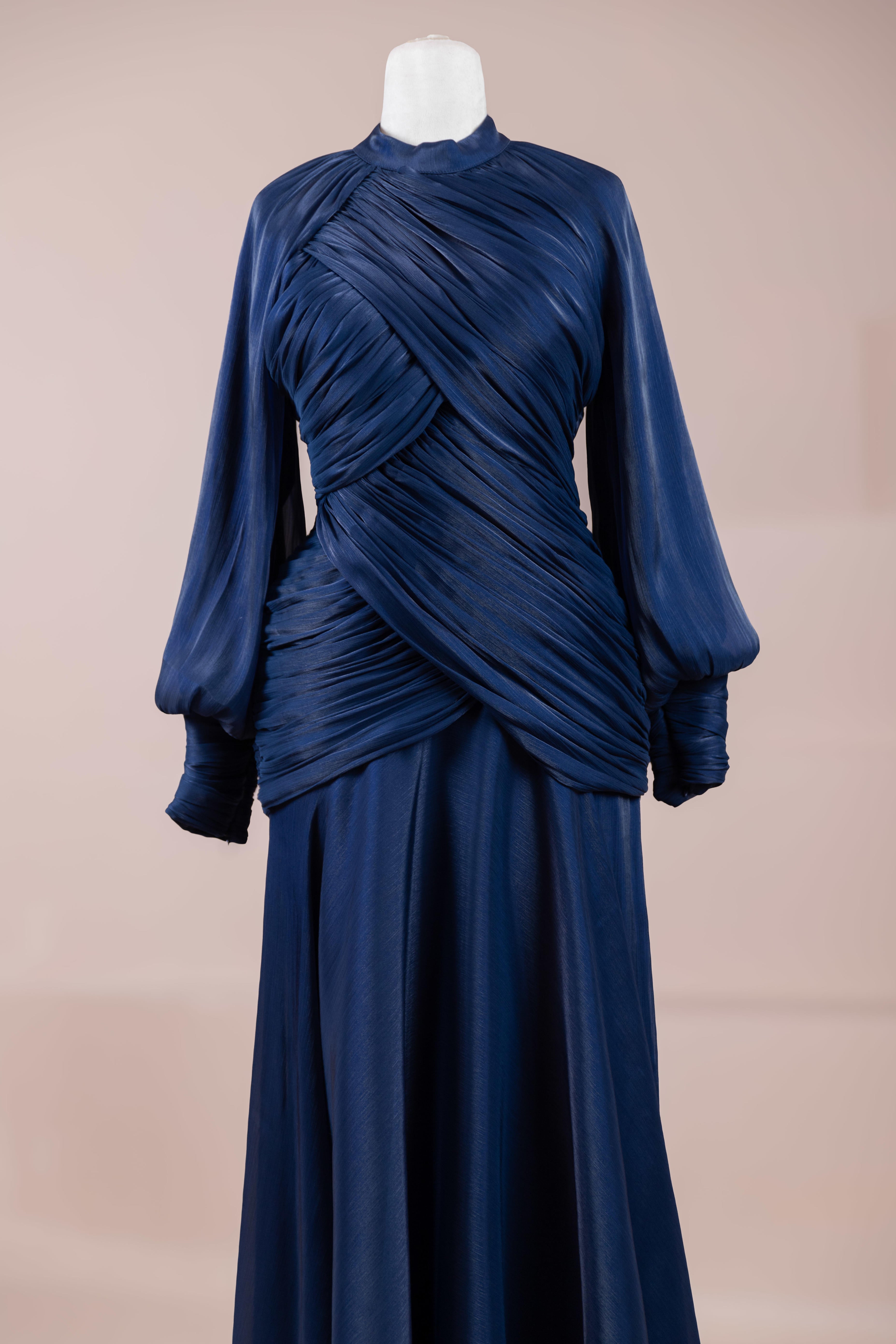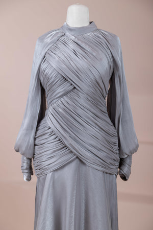 Zarif ve akıcı bir silüete sahip bu tasarım, bedeni saran drapeli üst formu ve dökümlü etek yapısıyla feminen bir duruş sunar. Yüksek yakalı ve uzun kollu kesimiyle sofistike bir görünüm sağlarken, çapraz drape detayları bele form kazandırarak vücut hatlarını zarif şekilde dengeler. Bileklerde toplanan kol formu tasarıma yumuşak bir hacim kazandırır. Uzun ve akışkan etek kesimi ise hareket özgürlüğü ve konfor sunar.