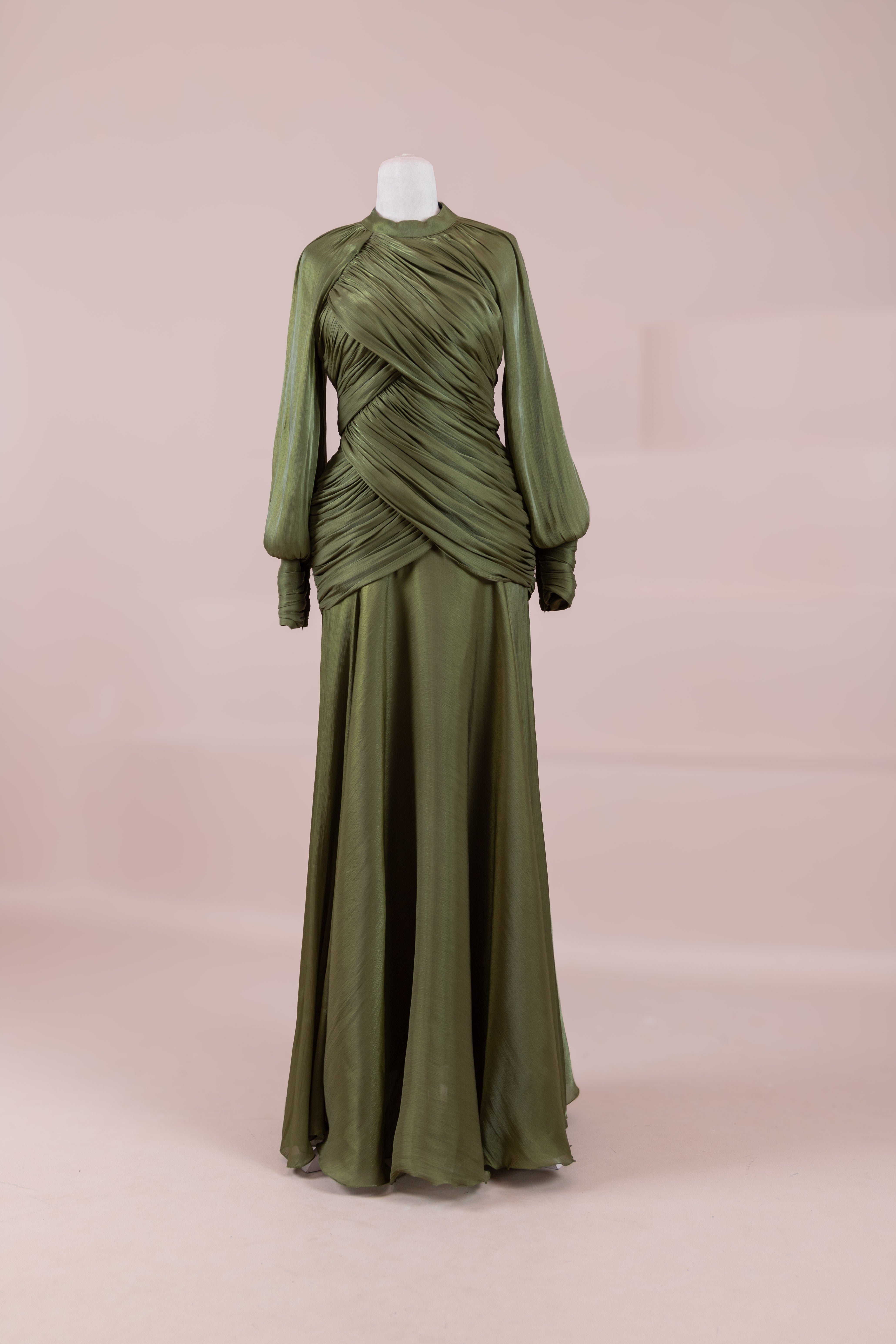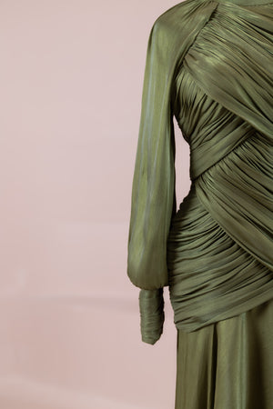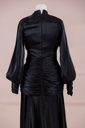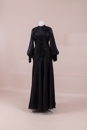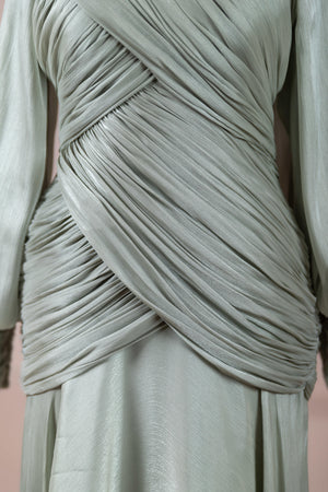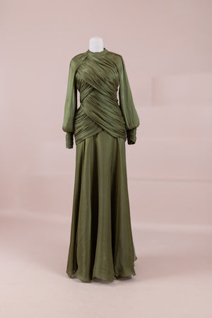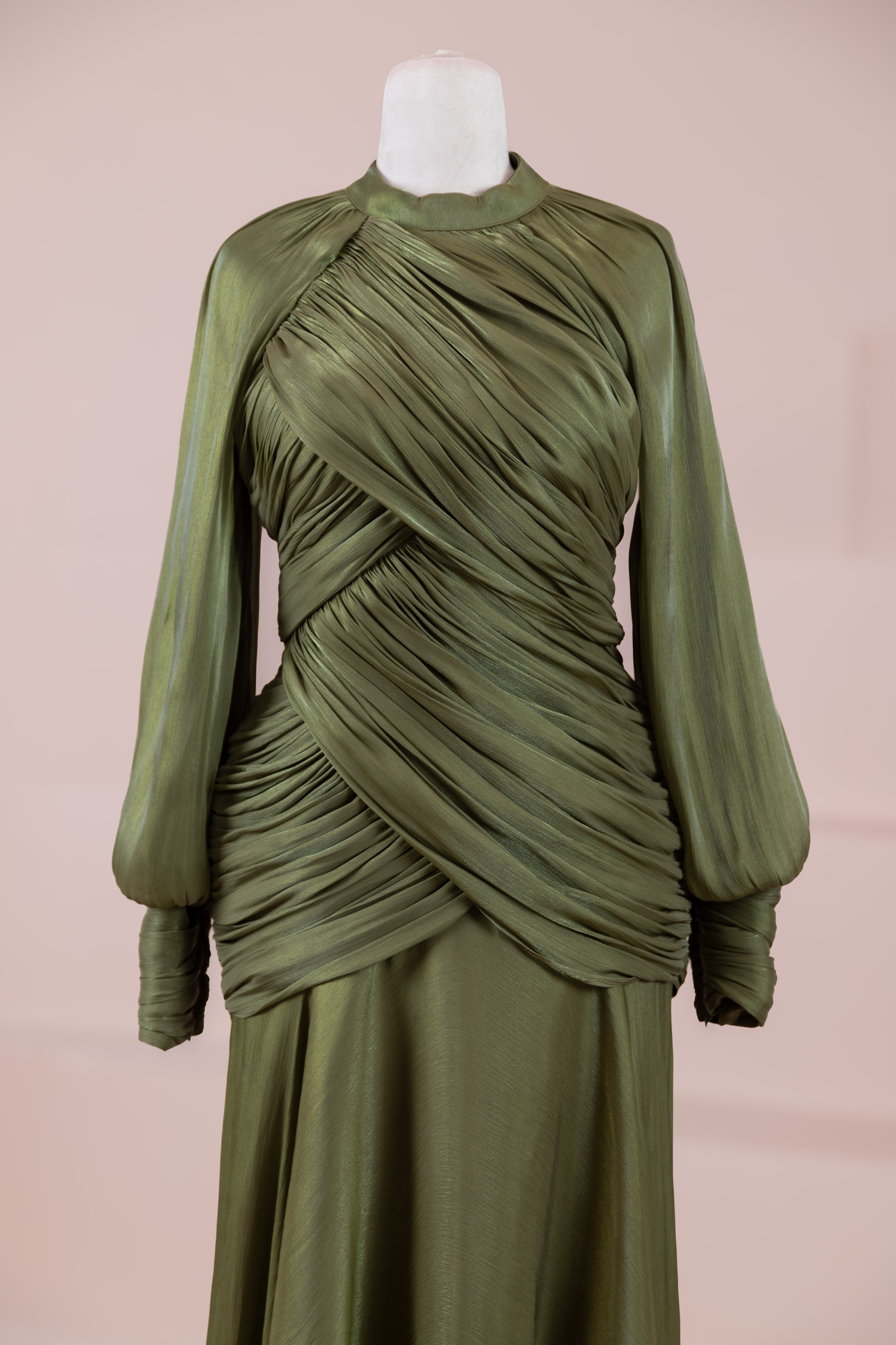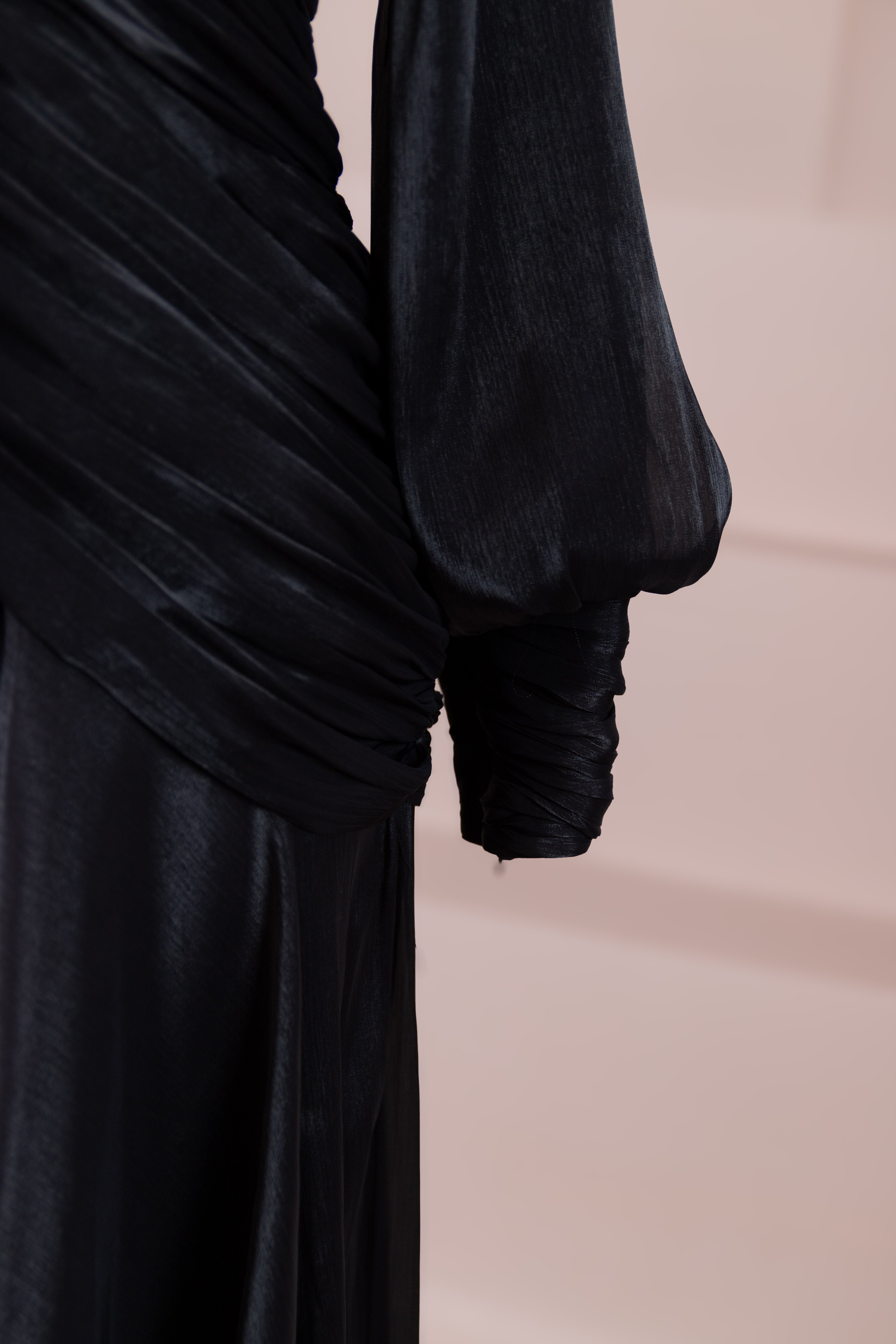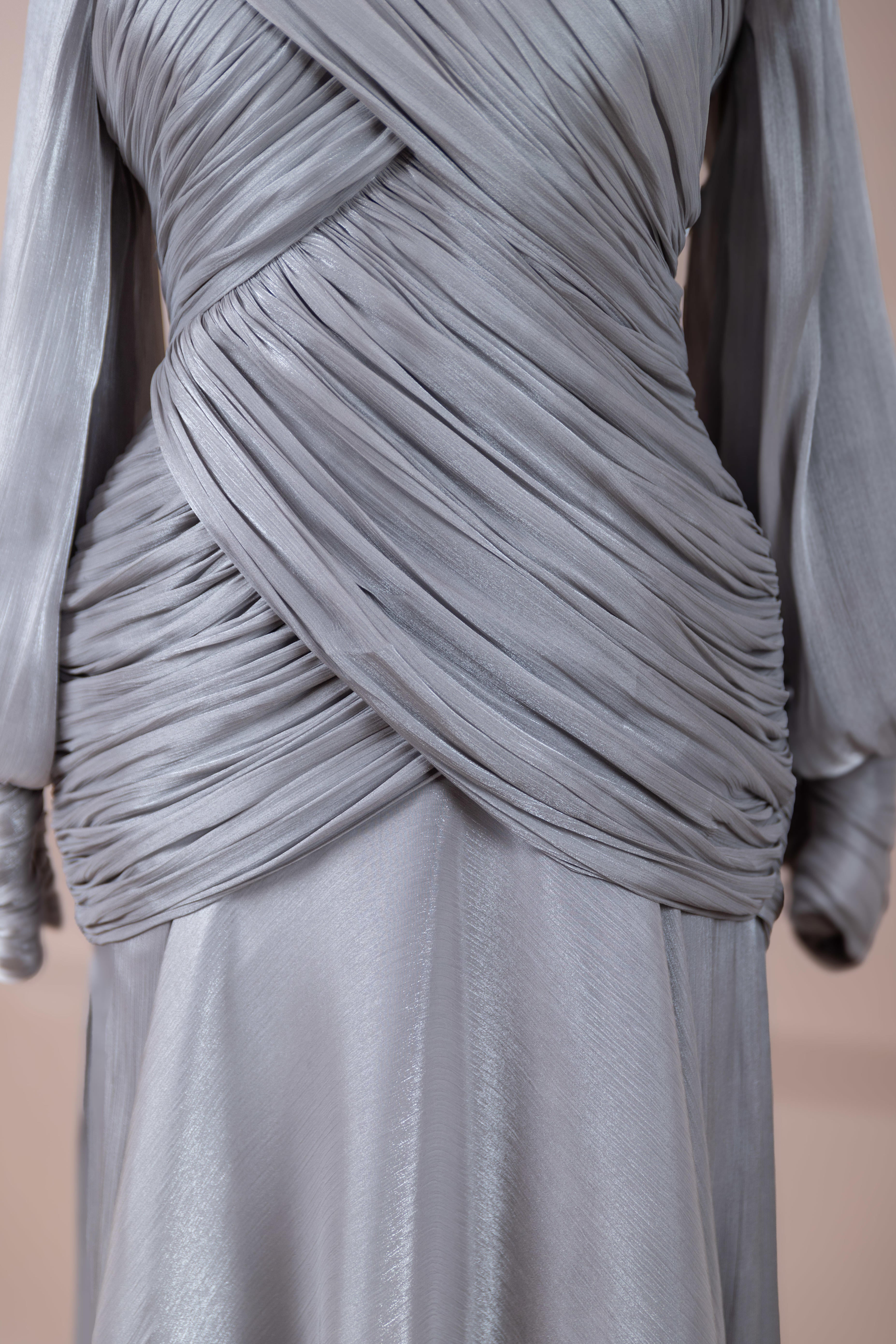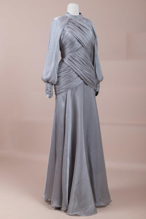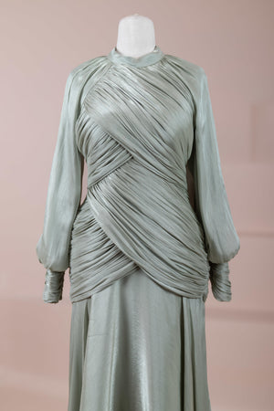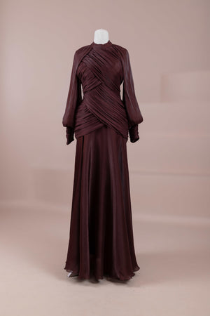 Zarif ve akıcı bir silüete sahip bu tasarım, bedeni saran drapeli üst formu ve dökümlü etek yapısıyla feminen bir duruş sunar. Yüksek yakalı ve uzun kollu kesimiyle sofistike bir görünüm sağlarken, çapraz drape detayları bele form kazandırarak vücut hatlarını zarif şekilde dengeler. Bileklerde toplanan kol formu tasarıma yumuşak bir hacim kazandırır. Uzun ve akışkan etek kesimi ise hareket özgürlüğü ve konfor sunar.