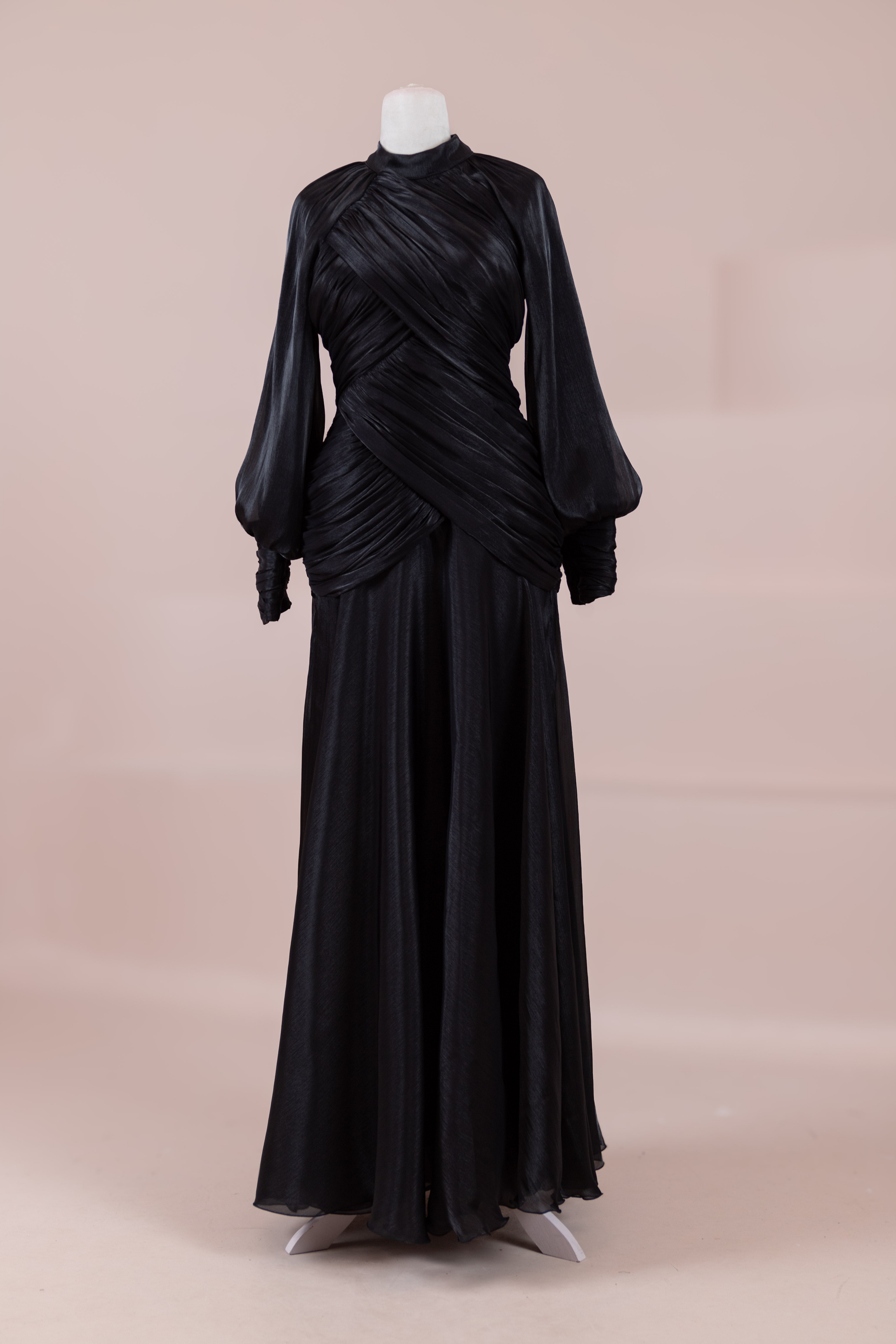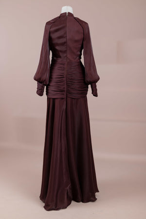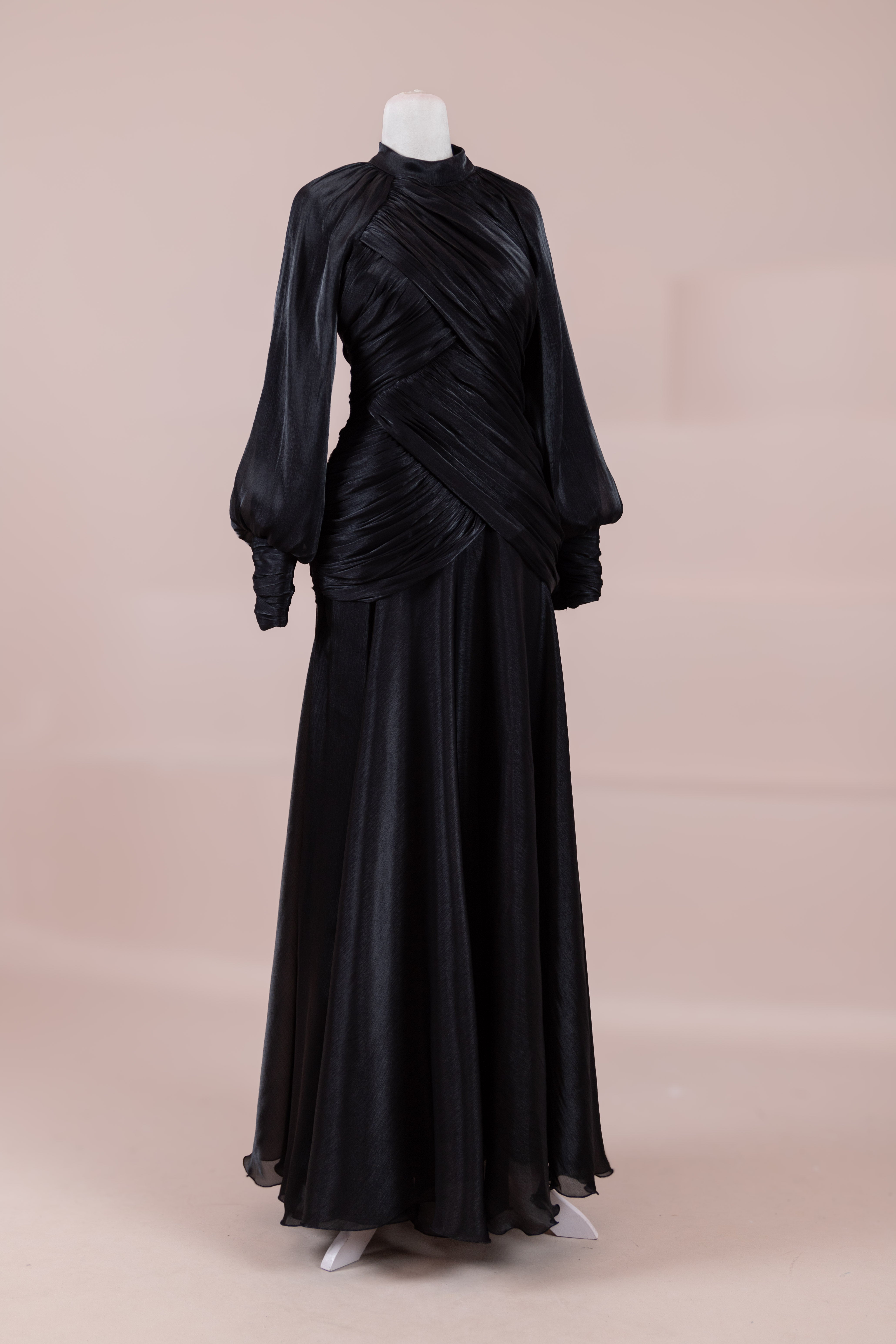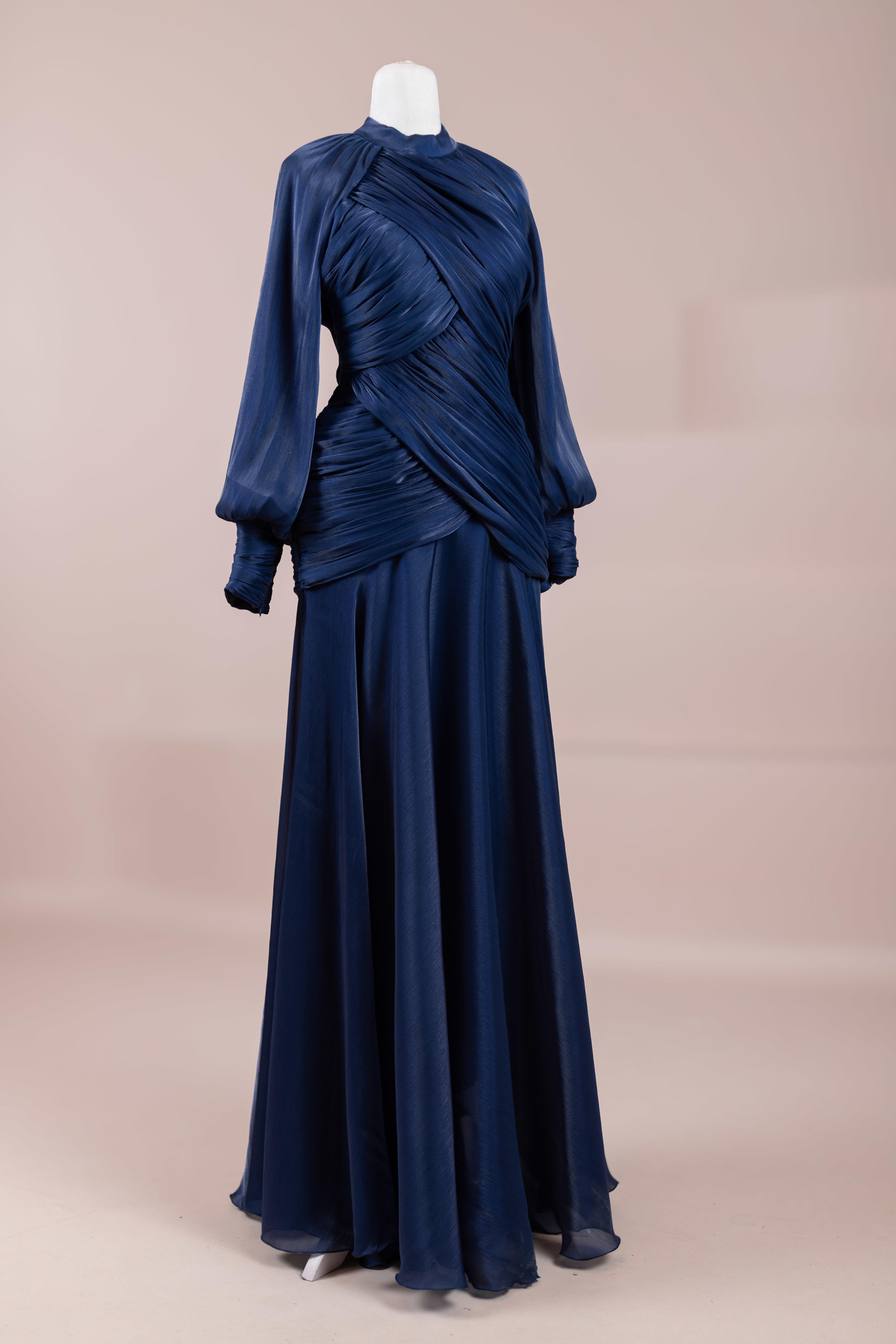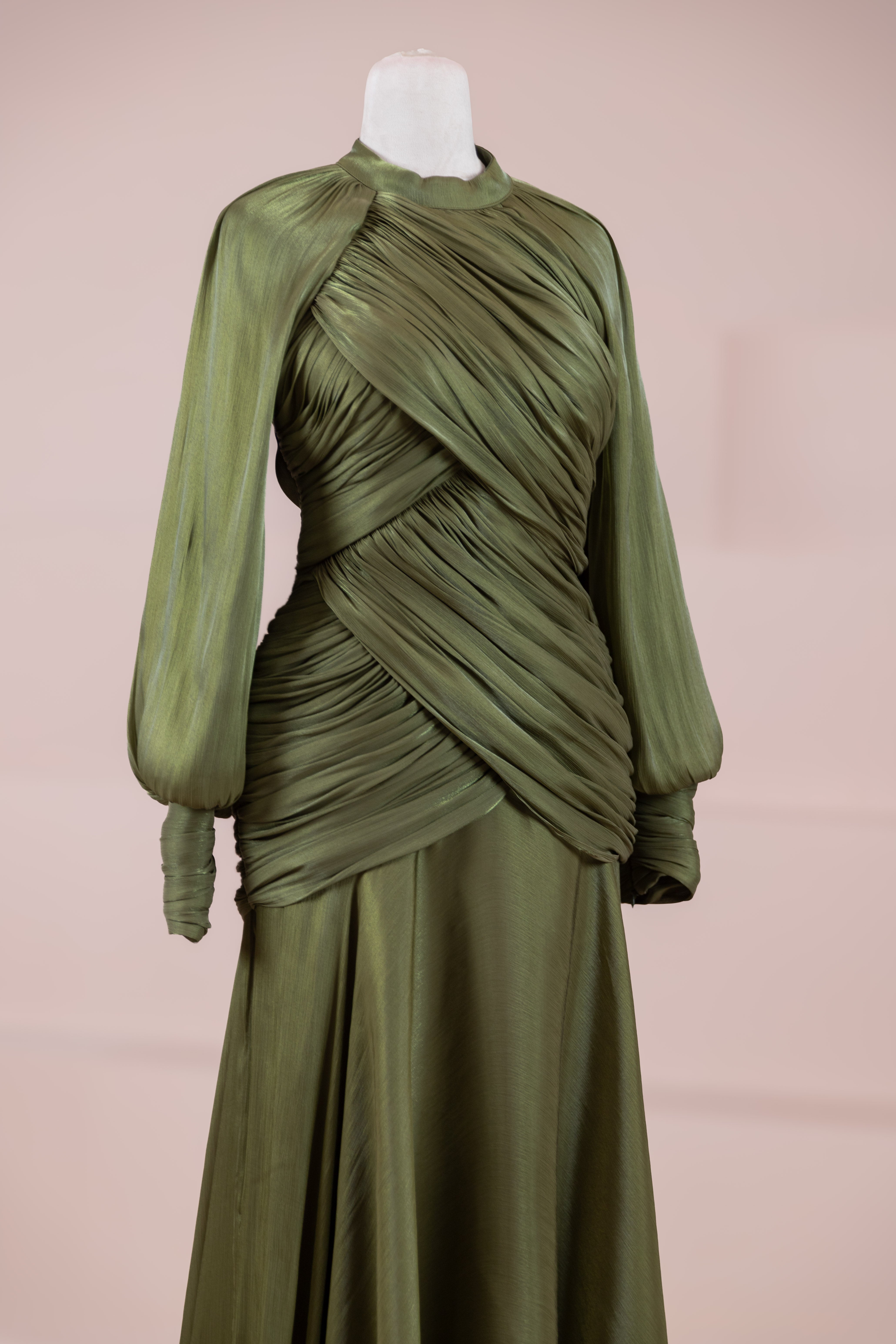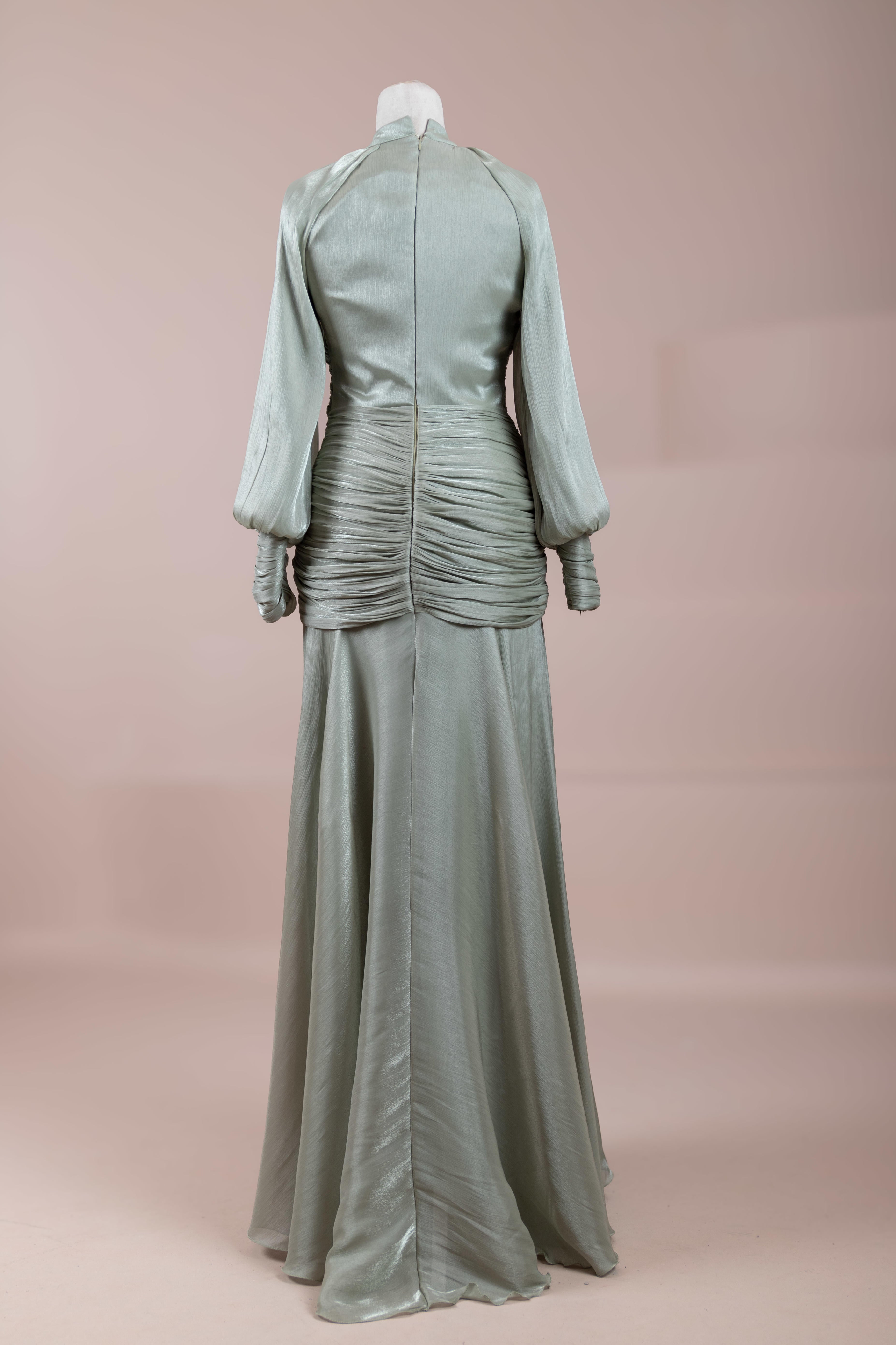 Zarif ve akıcı bir silüete sahip bu tasarım, bedeni saran drapeli üst formu ve dökümlü etek yapısıyla feminen bir duruş sunar. Yüksek yakalı ve uzun kollu kesimiyle sofistike bir görünüm sağlarken, çapraz drape detayları bele form kazandırarak vücut hatlarını zarif şekilde dengeler. Bileklerde toplanan kol formu tasarıma yumuşak bir hacim kazandırır. Uzun ve akışkan etek kesimi ise hareket özgürlüğü ve konfor sunar.