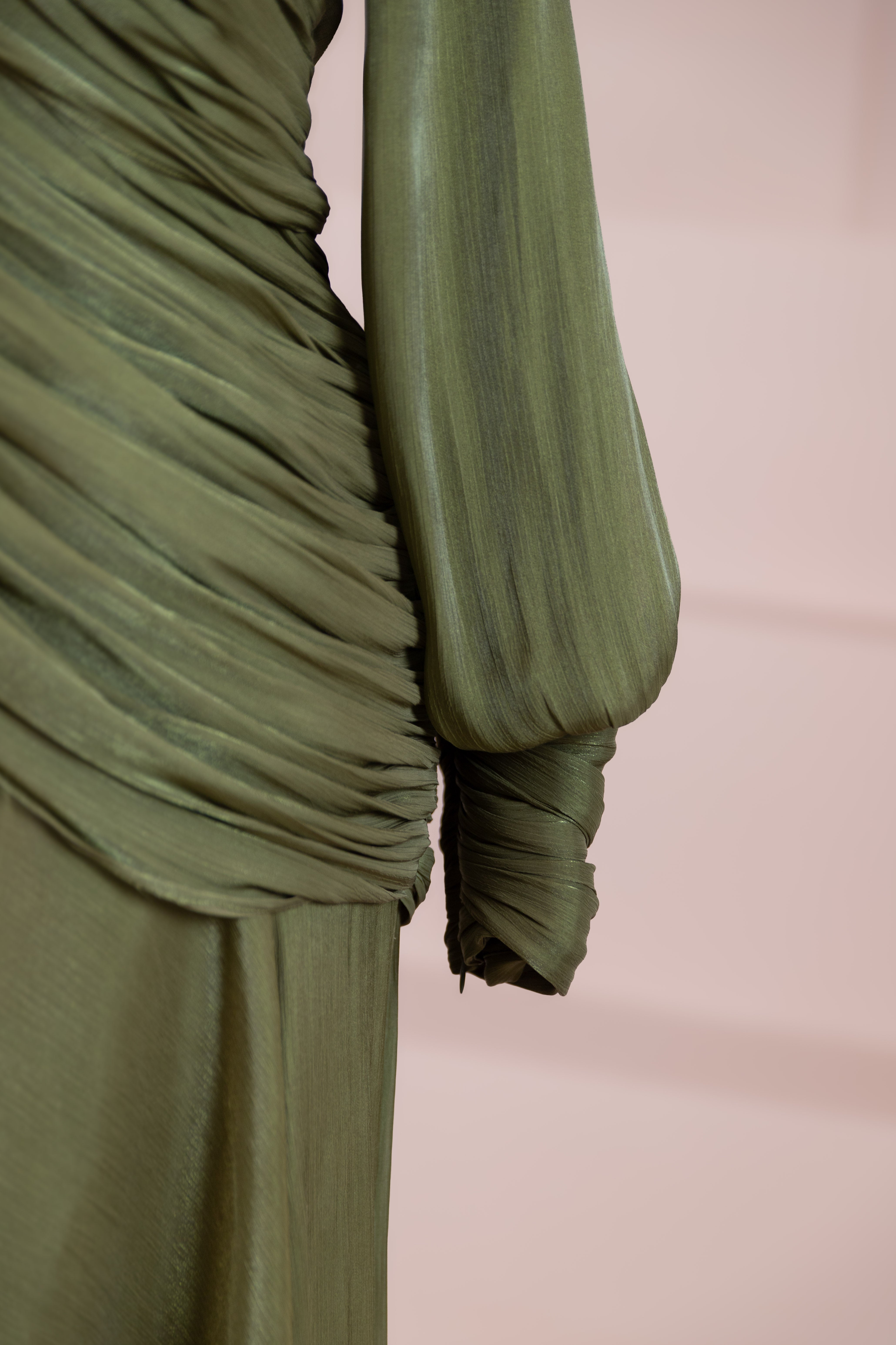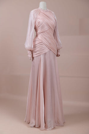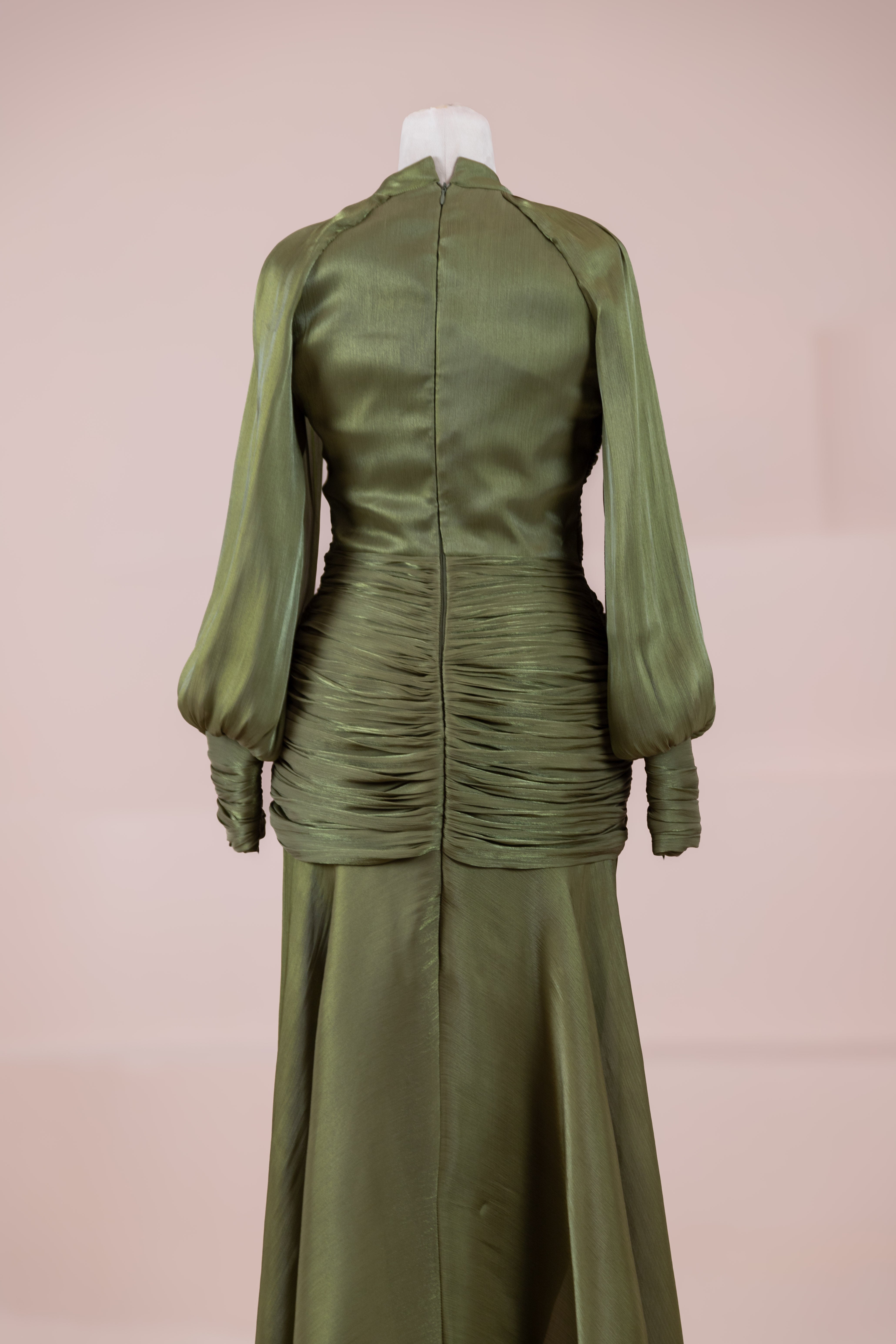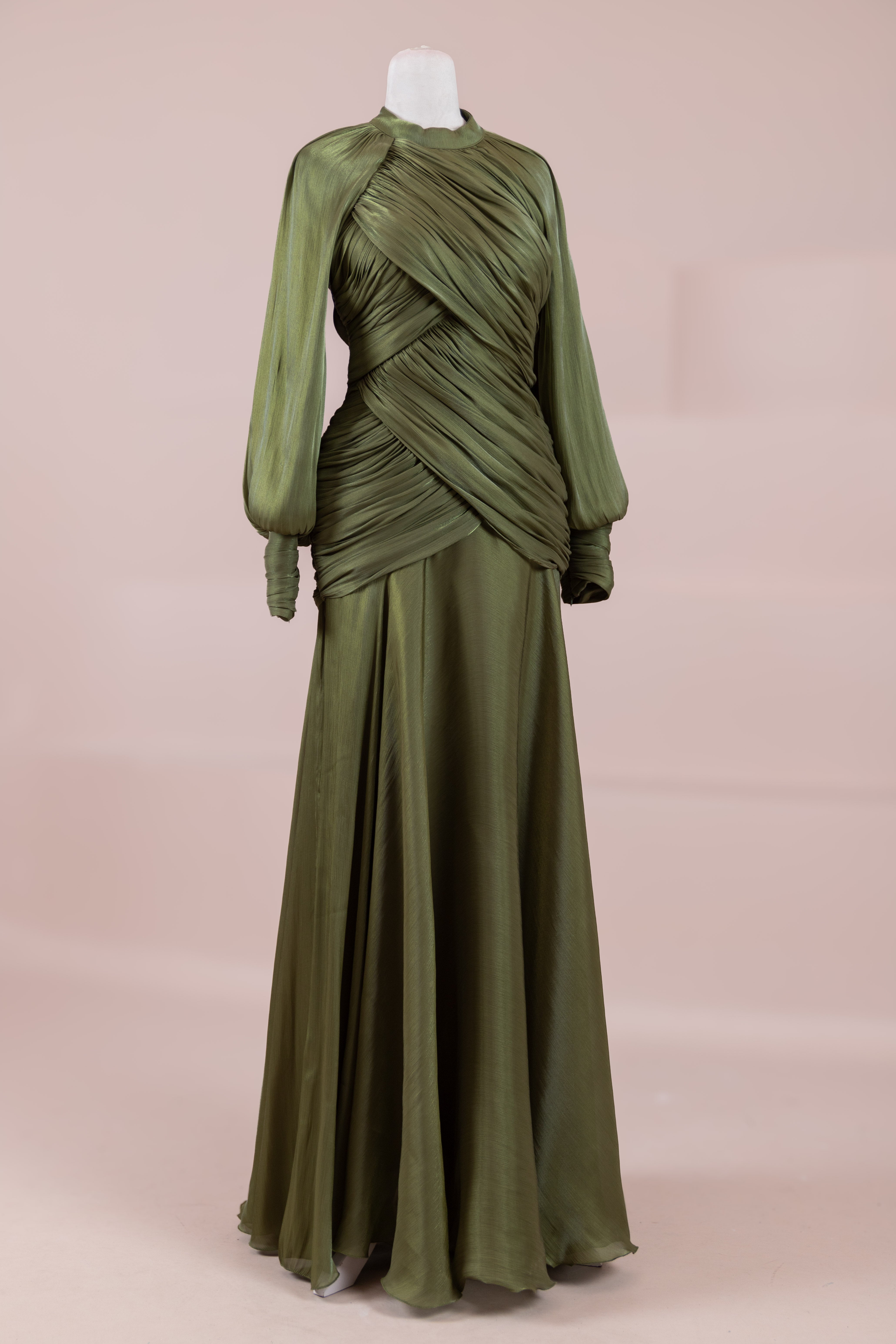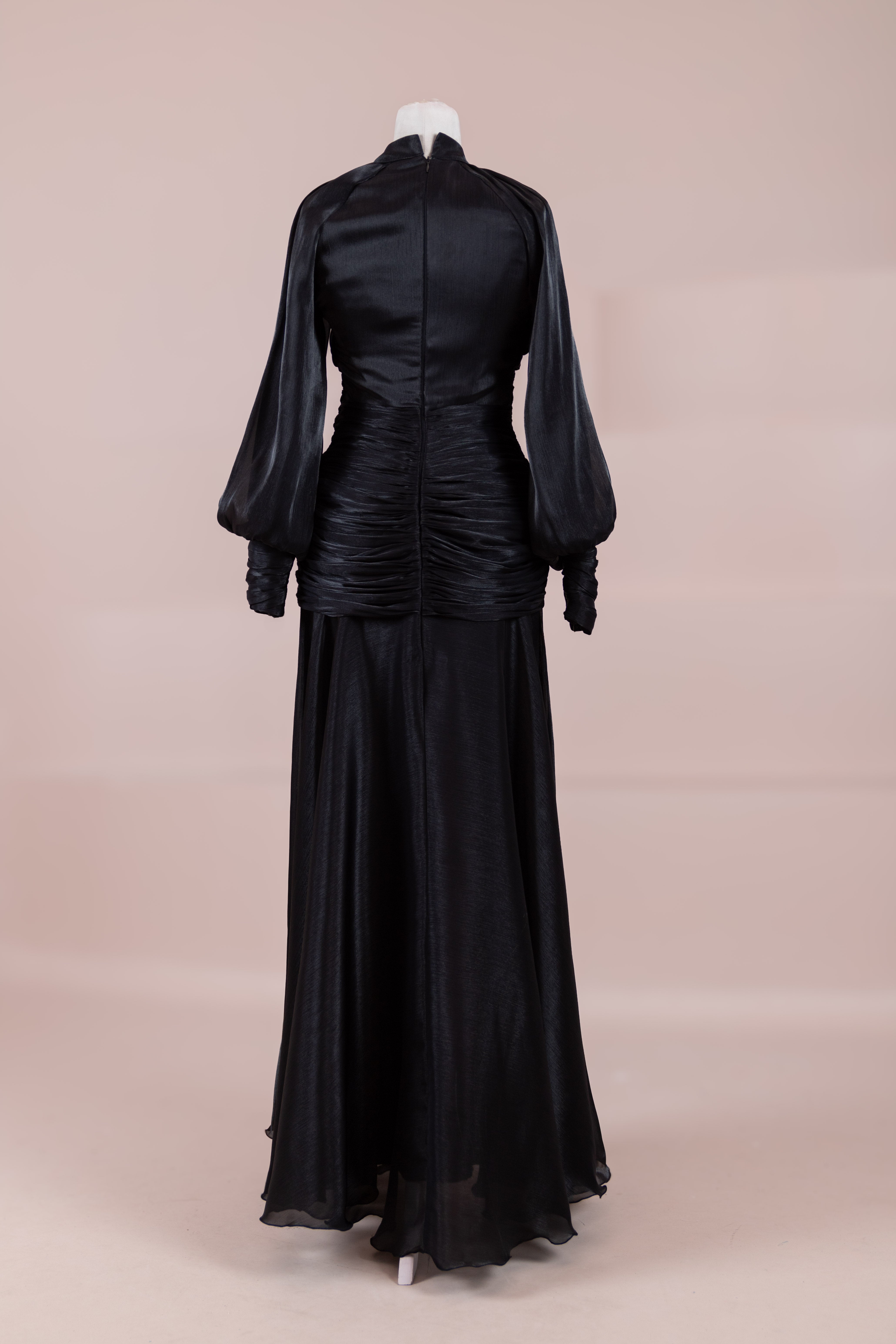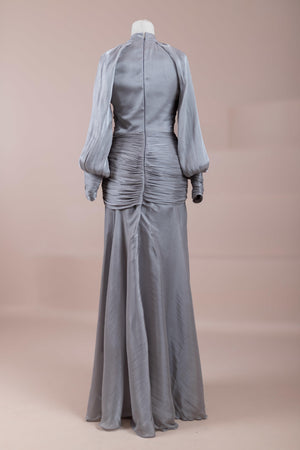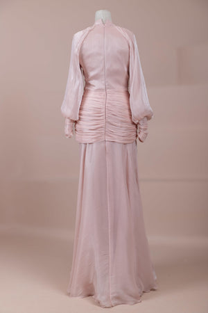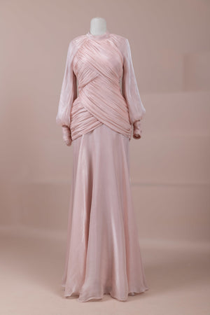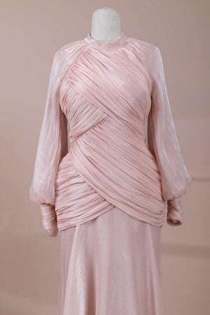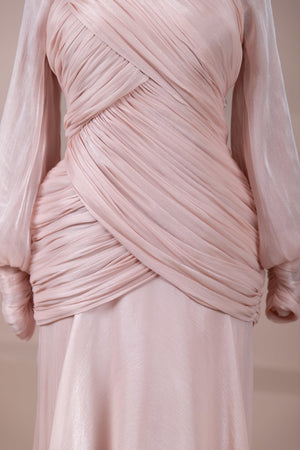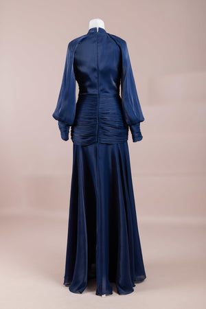 Zarif ve akıcı bir silüete sahip bu tasarım, bedeni saran drapeli üst formu ve dökümlü etek yapısıyla feminen bir duruş sunar. Yüksek yakalı ve uzun kollu kesimiyle sofistike bir görünüm sağlarken, çapraz drape detayları bele form kazandırarak vücut hatlarını zarif şekilde dengeler. Bileklerde toplanan kol formu tasarıma yumuşak bir hacim kazandırır. Uzun ve akışkan etek kesimi ise hareket özgürlüğü ve konfor sunar.